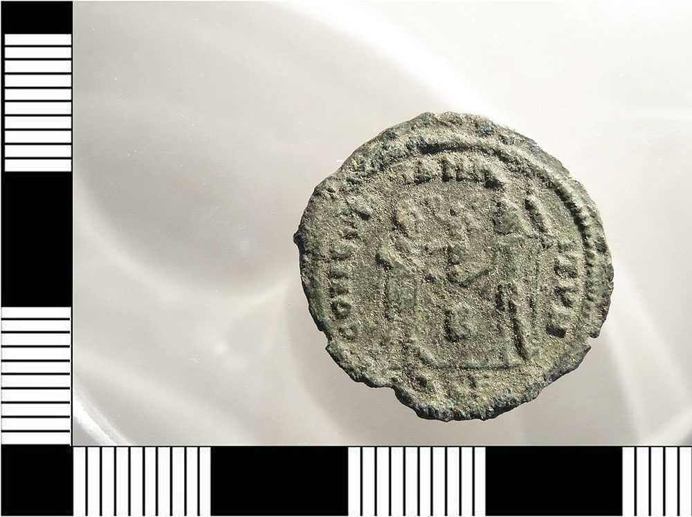 Dritto: Busto radiato di Galerio Massimiano a d., bordo perlinato. Rovescio: Principe stante a d. riceve una Vittoria su globo da Giove, stante a s. mentre si sostiene con uno scettro, bordo perlinato