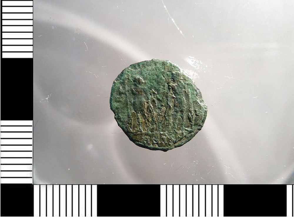 Dritto: Busto diademato, drappeggiato e corazzato di Costante a d., bordo perlinato. Rovescio: Due soldati, stanti frontalmente, ciascuno recante una lancia e con una mano appoggiata a uno scudo; tra di loro, un'insegna