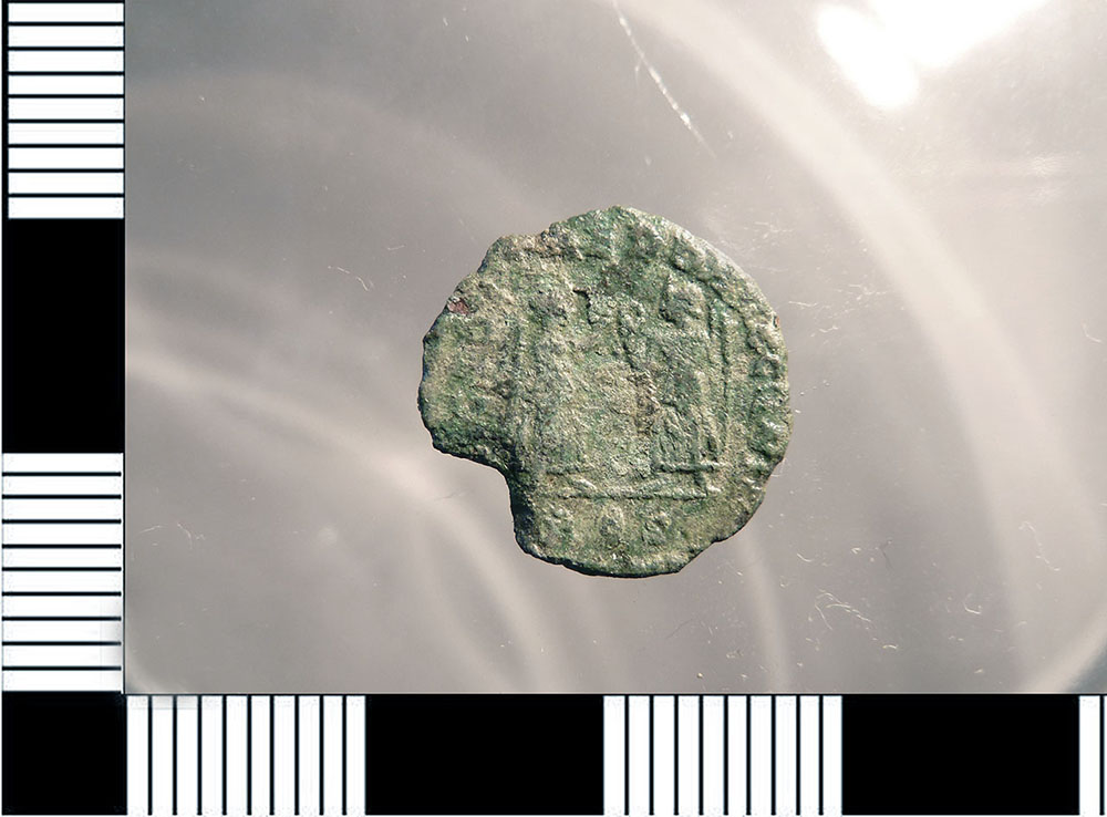 Dritto: Busto diademato, drappeggiato e corazzato di Costanzo II a d., bordo perlinato. Rovescio: Due Vittorie stanti l’una di fronte all’altra, entrambe recano una corona e un ramo di palma