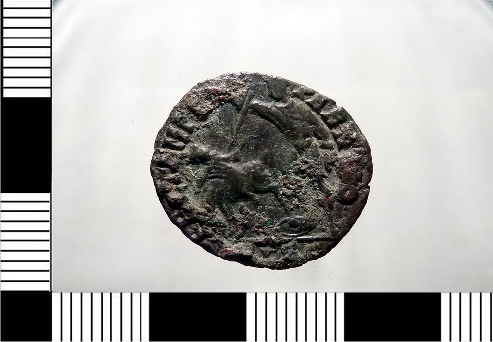 Dritto: Busto drappeggiato e corazzato di Costanzo Gallo a d., bordo perlinato. Rovescio: Soldato stante a s. abbatte un cavaliere, senza copricapo, che cadendo solleva il braccio s., a terra a d., uno scudo