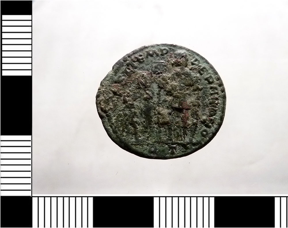 Dritto: Busto diademato, laureato, drappeggiato e corazzato di Costanzo II a s. che reca un globo nella mano d., bordo perlinato. Rovescio: L’Imperatore stante a s. reca nella mano d. un’insegna e si appoggia con la s. a uno scudo; di fronte a lui, due prigionieri stanti con cappello a punta si guardano reciprocamente, bordo perlinato