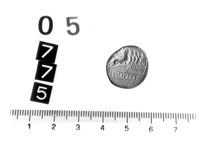 Dritto: Apollo con testa laureata a destra, bordo puntinato. Rovescio: Minerva su quadriga a destra, tiene nella sinistra le redini e una lancia, nella destra un trofeo. Bordo puntinato
