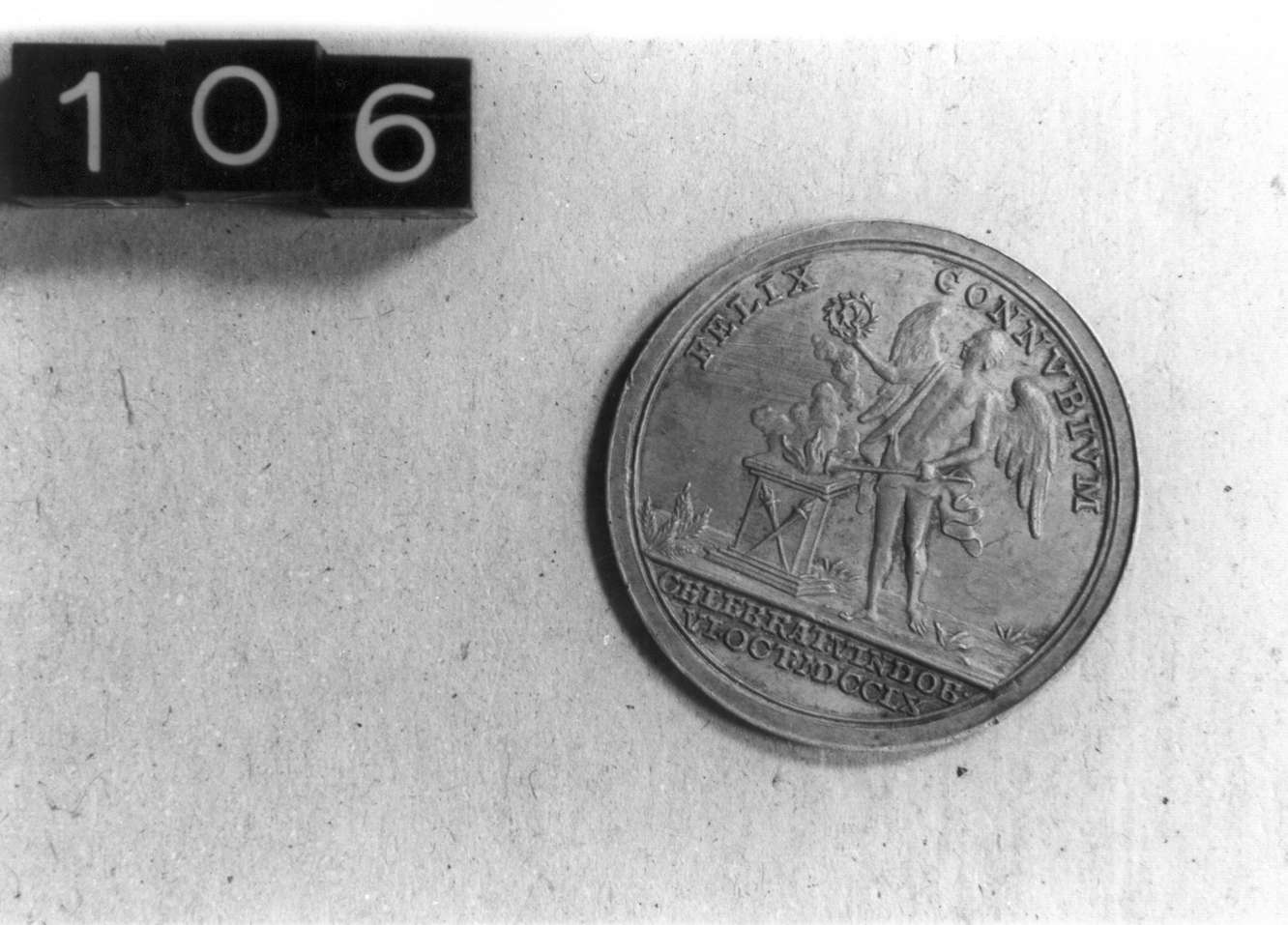 Dritto: Busti accollati a destra, il Principe col nastro e il Tonsone d'oro, la principessa con veste e acconciatura di pizzo. Rovescio: Hymen, genio alato, stante accende il fuoco su un'ara mentre brandisce con la mano destra due corone incrociate
