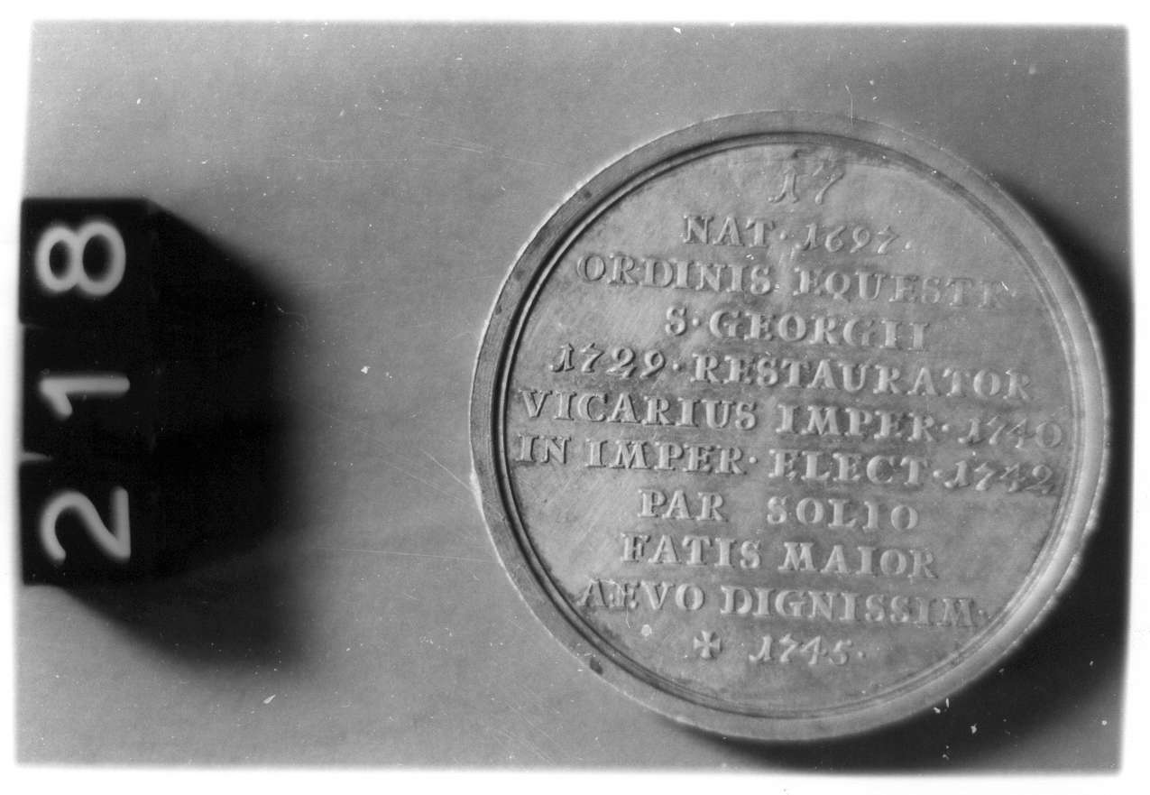 Dritto: Busto di 3/4 a destra, all'eroica con parruccone, corona d'alloro in capo; indossa armatura a squame all'antica; ha ilmantello trattenuto da fermaglio ingioiellato sulla spalla sinistra e il collare del tonsone d'oro sul petto. Rovescio: Iscrizione in 11 righe