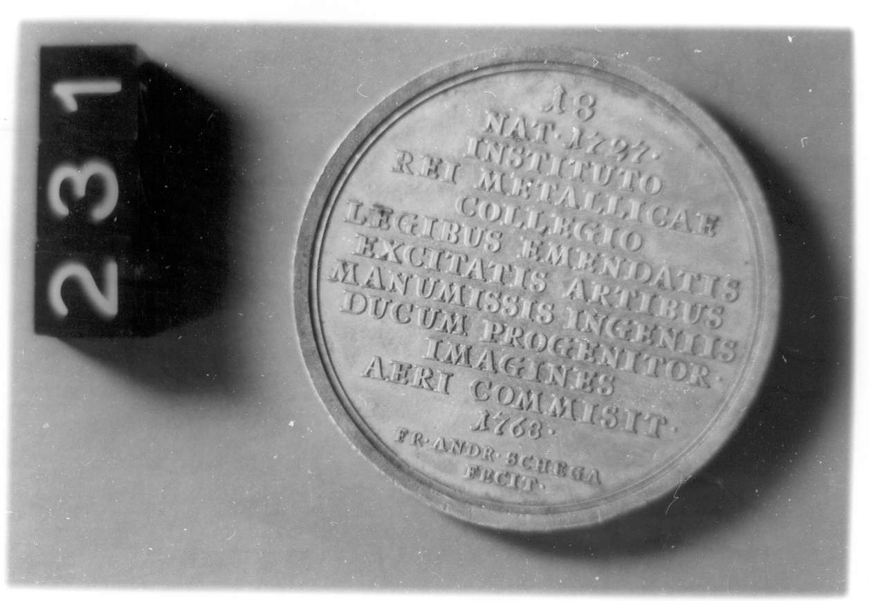 Dritto: Busto armato di 3/4 a destra, testa di profilo con capelli mossi lunghi trattenuti da nastro sulla nuca; ha mantello con l'ermellino, fascia che attravesra il petto, decorazione sulla spalla sinistra e il tonsone d'oro sul petto; al collo bordo di camicia mosso e sciarpa stretta. Rovescio: Iscrizione in 12 righe più 2 di modulo inferiore