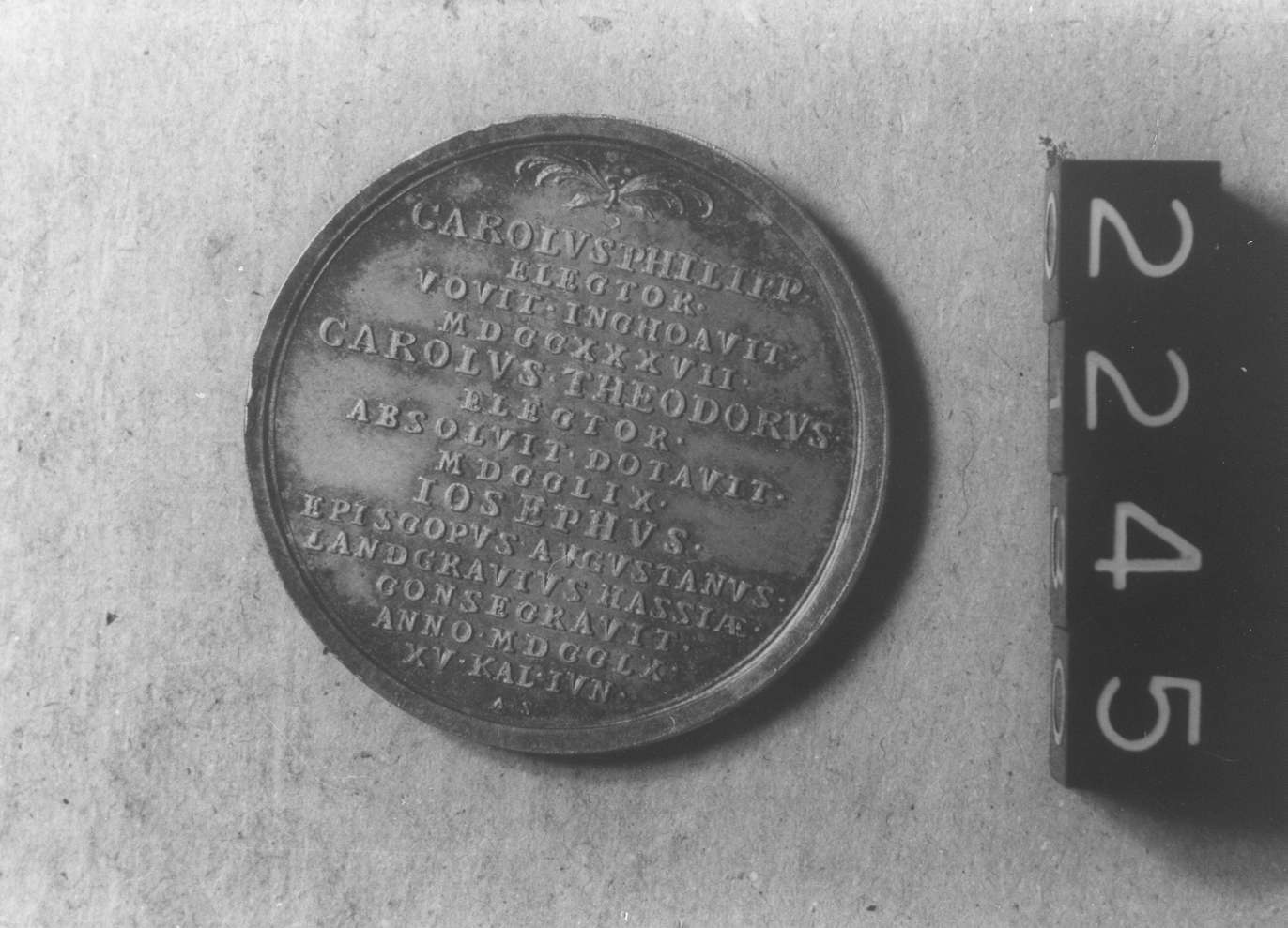 Dritto: Prospetto della chiesa dei Gesuiti a Mannheim, facciata con porticato a frontone e doppio campanile, alta cupola alla crociera, sulla piazza, passanti ed una carrozza trainata da cavalli. Rovescio: Iscrizione in 14 righe sotto due racemi di palma annodati