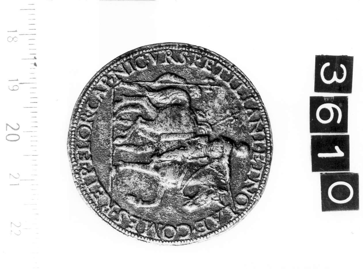 Dritto: Busto di Niccolò Orsini, conte di Pitigliano verso sinistra a capo nudo e con armatura. Rovescio: Il conte a cavallo verso destra, con bastone di comando, accompagnato da due palafrenieri a sinistra e in secondo piano; il secondo seminascosto dal cavallo e porta un elmo