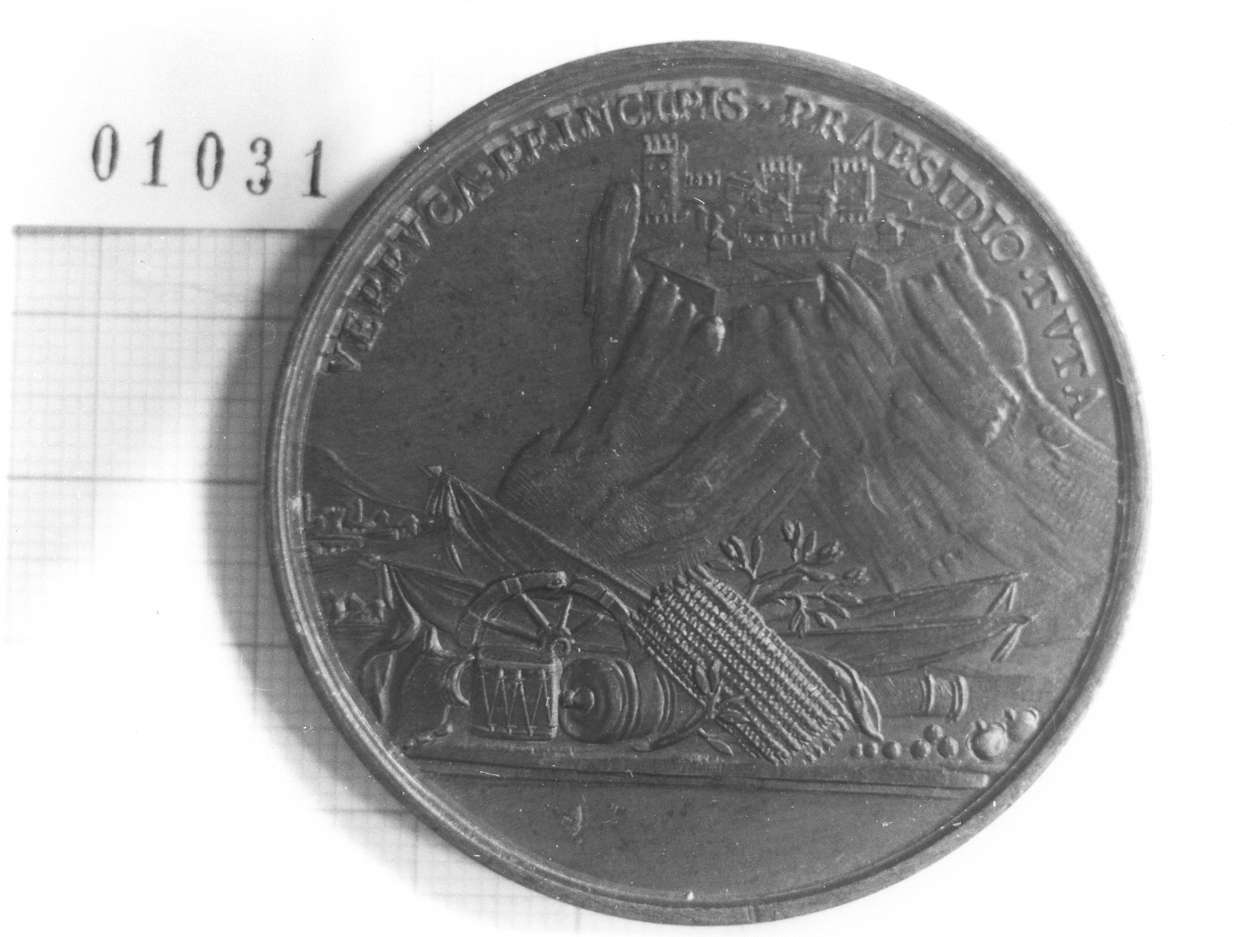 Dritto: Busto virile armato a destra capelli ondulati barba e baffi ampio colletto di merletto ondulato, gorgiera a lame bullettate e perlinate, croce di Savoia sul petto, spallaccio spigolato, mantello con orlo perlinato. Collare dell'Annunziata sul petto. Rovescio: Monte coronato da fortezza con presidio di assedianti in primo piano: cannoni, tambuti, palle di cannone, bandiere e racemo d'olivo, in fondo a sinistra la città. Ricordo dell'assedio di Verrua nel 1625