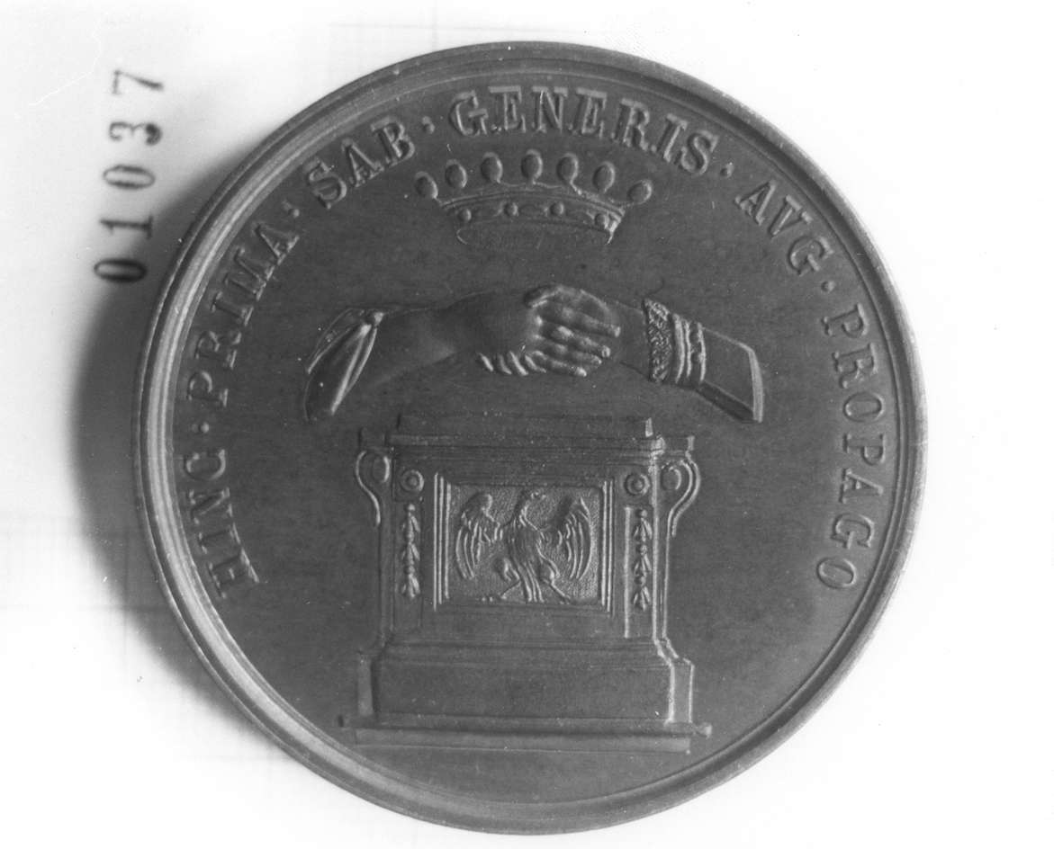 Dritto: Busto a destra capelli lunghi sul collo e corona di fiori in capo, veste accollata e mantello sulle spalle, collana di gemme e doppio giro di catena. Rovescio: Ara ornata di aquila al ali spiegate sotto due mani che si stringono e sotto una corona comitale. Allegoria del matrimonio di caterina e Beroldo