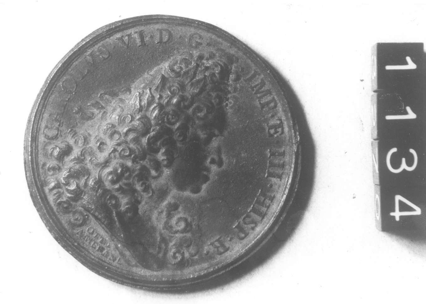 Dritto: Busto a destra con parruccone e lunghi capelli sulle spalle e sul busto. Rovescio: Genio della guerra, alato con una spada nella mano, stante sopra un globo iscritto; dietro trionfo d'armi e vessilli; al lato destro e sul davanti fiumi Bega e Danubio