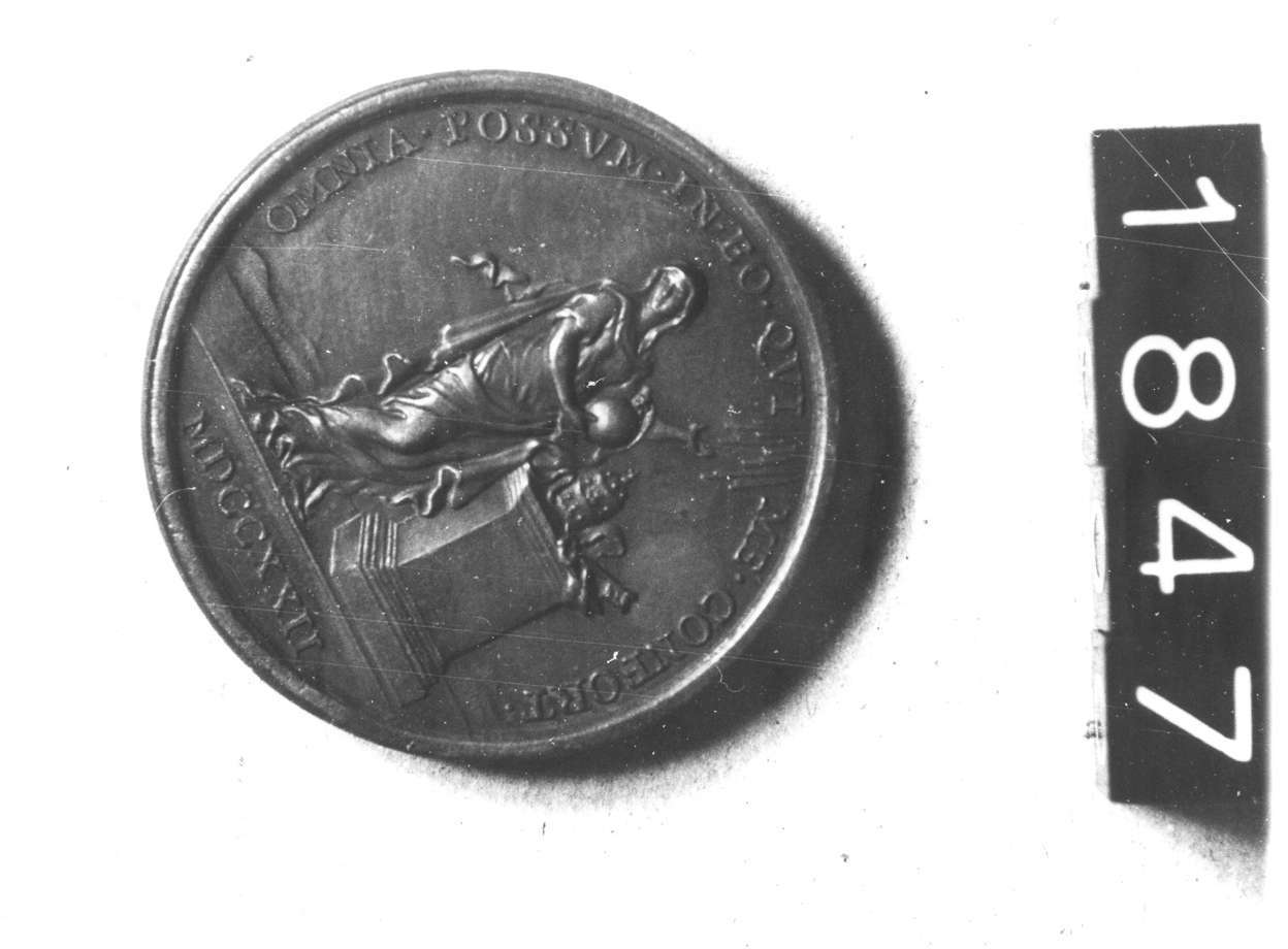 Dritto: Busto a destra con triregno e piviale ricamato con Madonna seduta col Bambino in grembo, raggianti, entro specchio ovale. Rovescio: La Fede, stante col globo accanto ad un piedistallo con il triregno e le chiavi, indica con la mano sinistra la luce divina