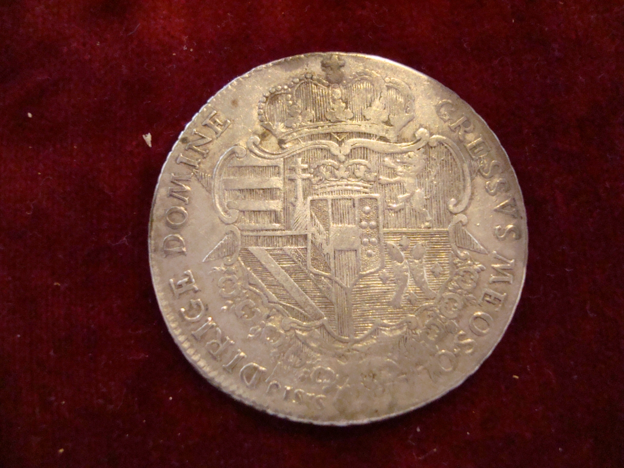 Dritto: busto corazzato a destra; accette incrociate. Rovescio: stemma a targa barocca coronato