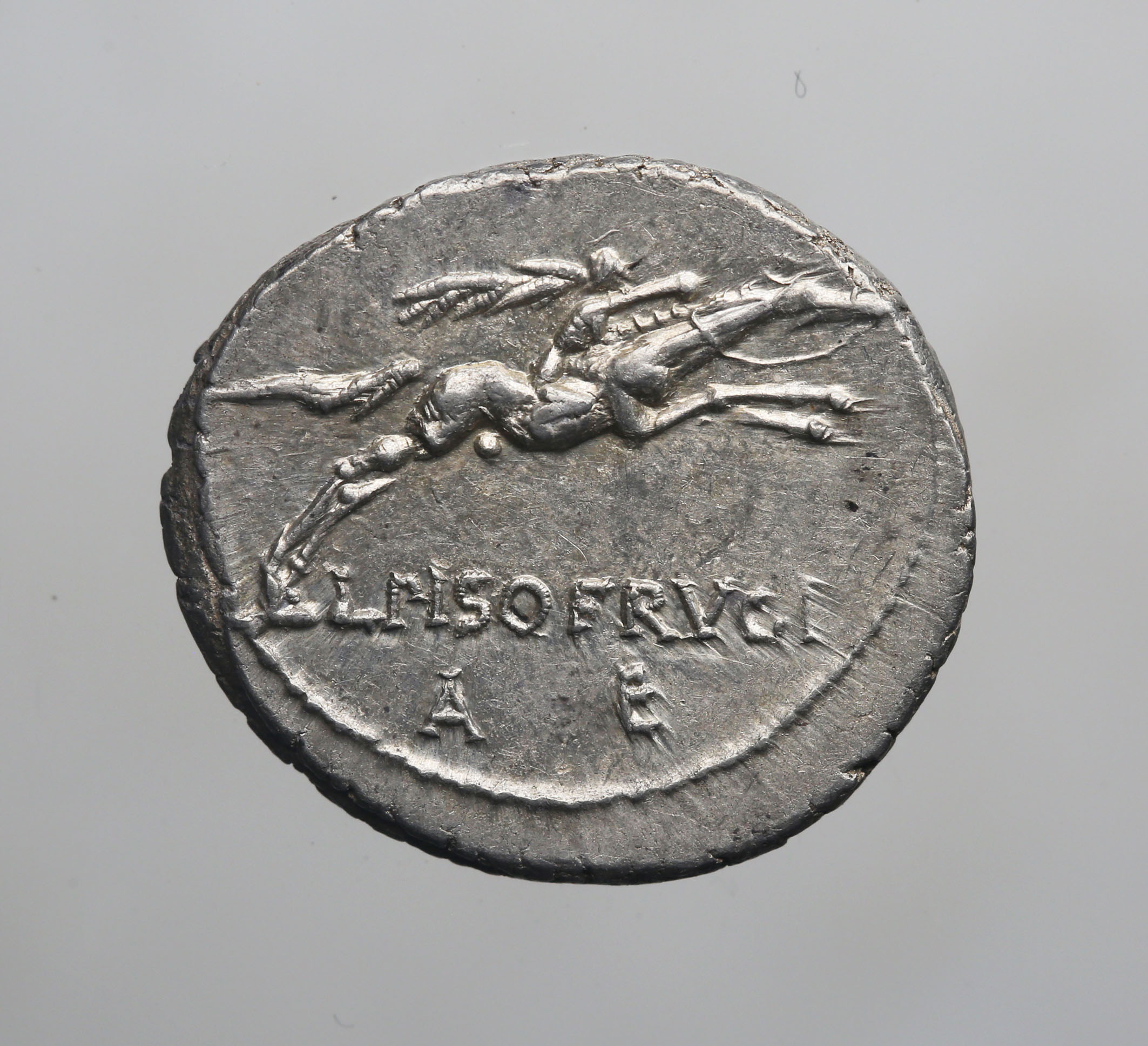Dritto: Testa laureata di Apollo a d.; davanti, numero di controllo II; Contorno perlinato. Rovescio: Cavaliere al galoppo a d.; tiene le redini con la mano d., un ramo di palma con la s.; sotto, su due righe L•PISO FRVGI / A E. Contorno perlinato