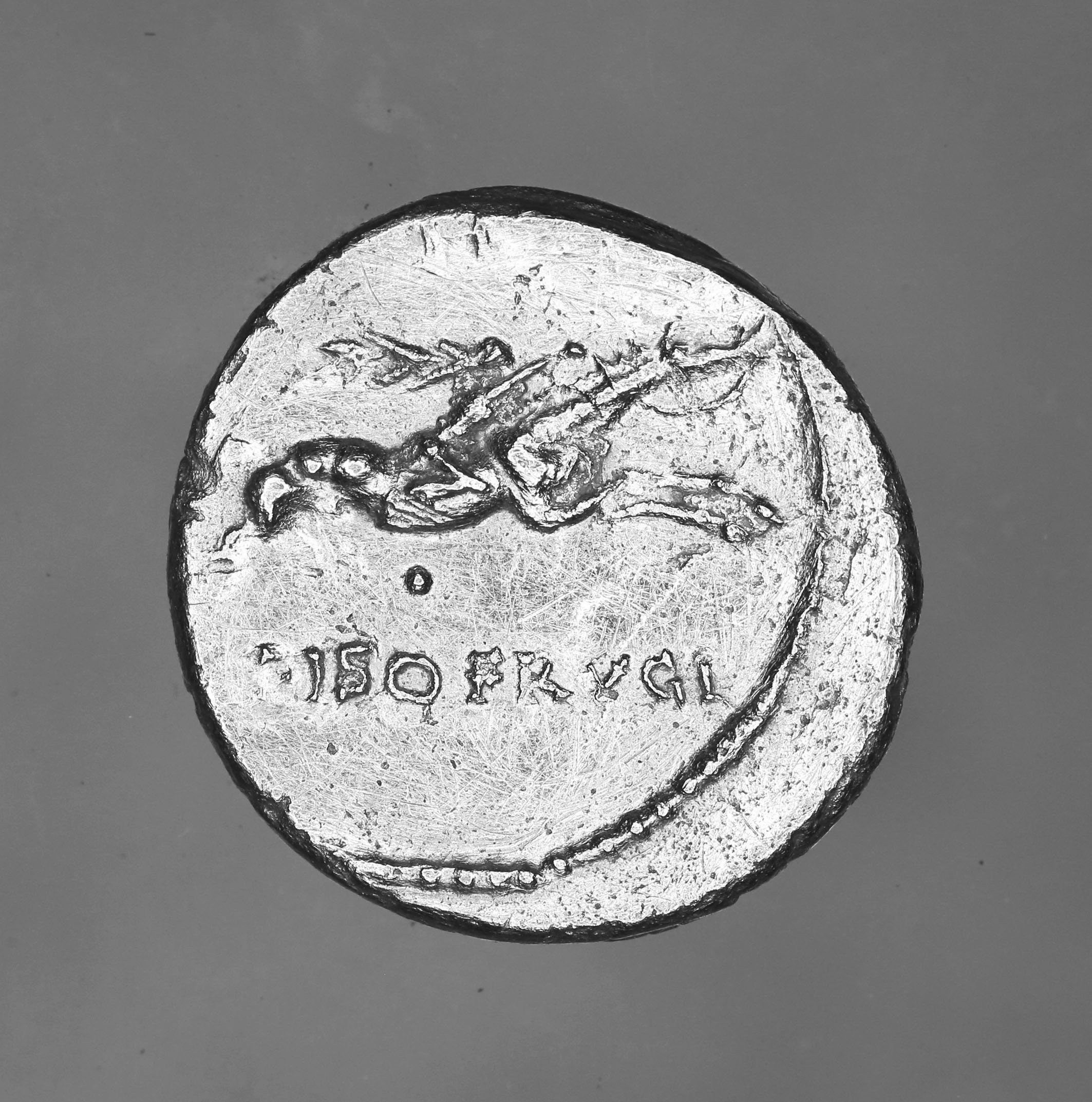Dritto: Testa laureata di Apollo a d.; dietro, un simbolo di controllo (arco e colonna?). Contorno perlinato. Rovescio: Cavaliere al galoppo a d.; tiene le redini con la mano d., un ramo di palma con la s.; sotto •[L]•PISOFRVGI. Contorno perlinato