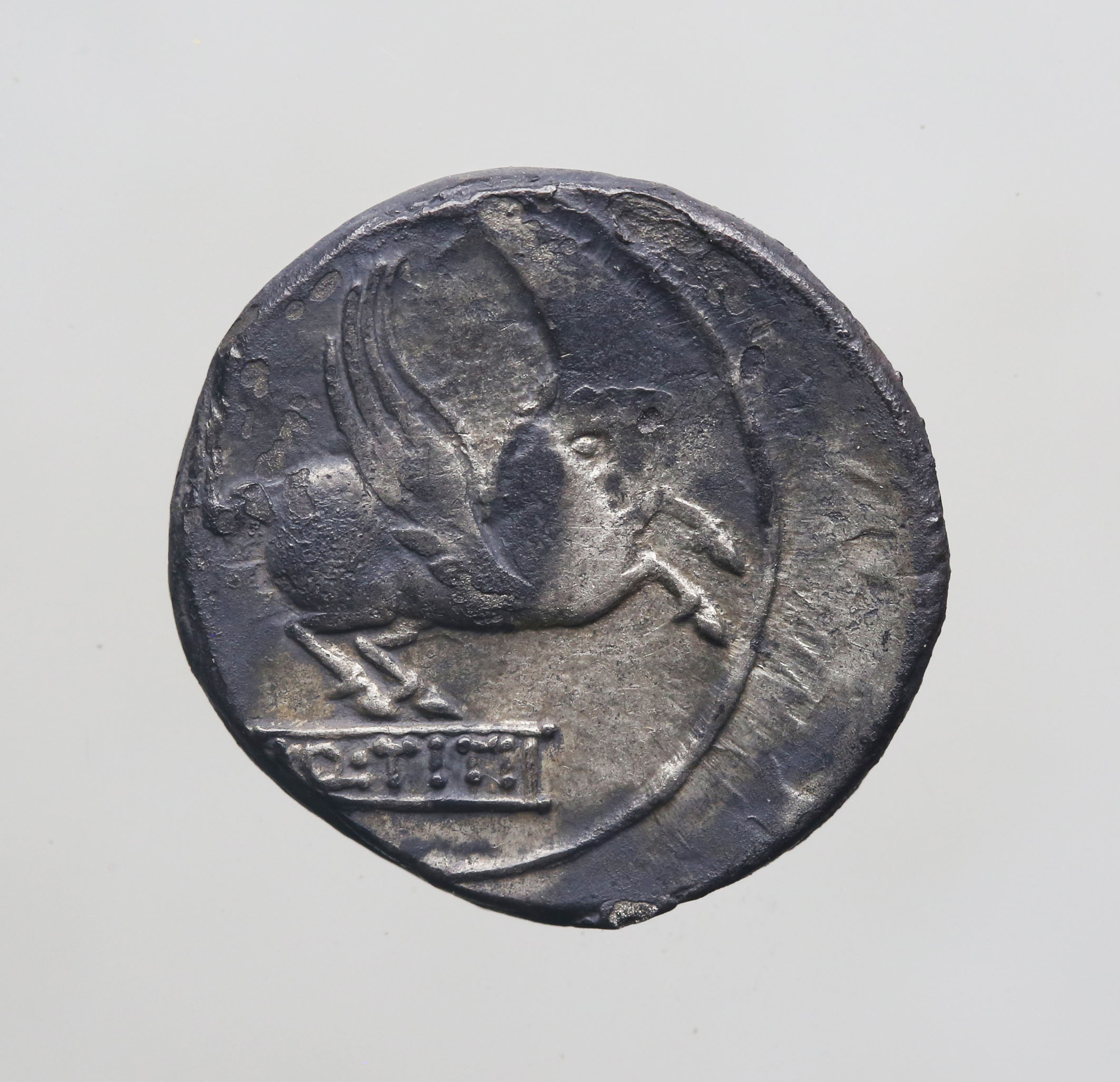 Dritto: Testa barbata maschile (Mutinus Titinus) a d.. Contorno lineare. Rovescio: Pegaso in atto di spiccare il volo a d.; sotto, entro cornice lineare Q•TITI. Contorno lineare