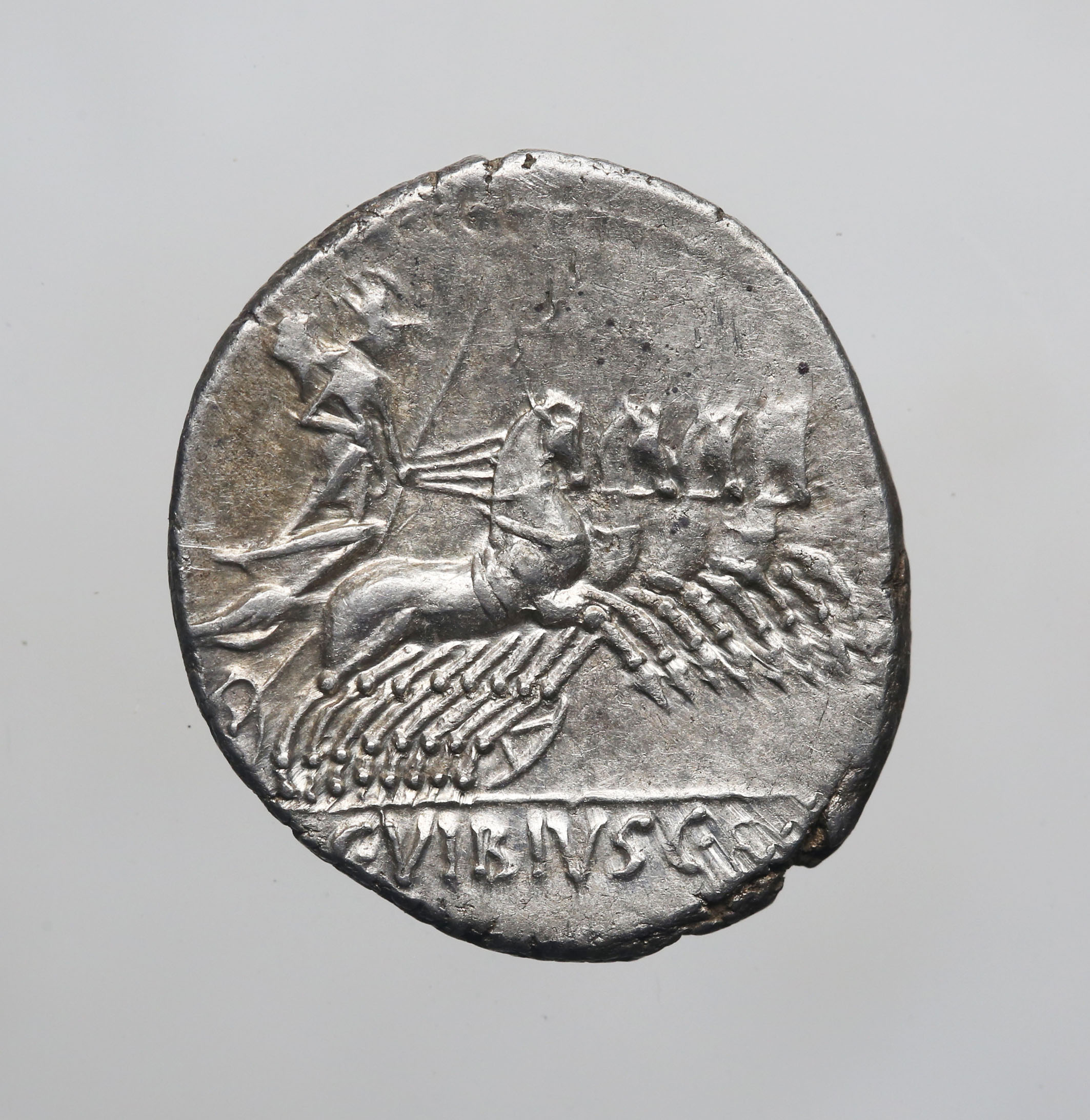 Dritto: Testa laureata di Apollo a d.; dietro, PANSA; davanti, un simbolo di controllo (elmo). Contorno perlinato. Rovescio: Minerva su quadriga verso d.; tiene la lancia e le redini con la mano s., un trofeo con la d.; in esergo, C•VIBIVS•C•F . Contorno perlinato