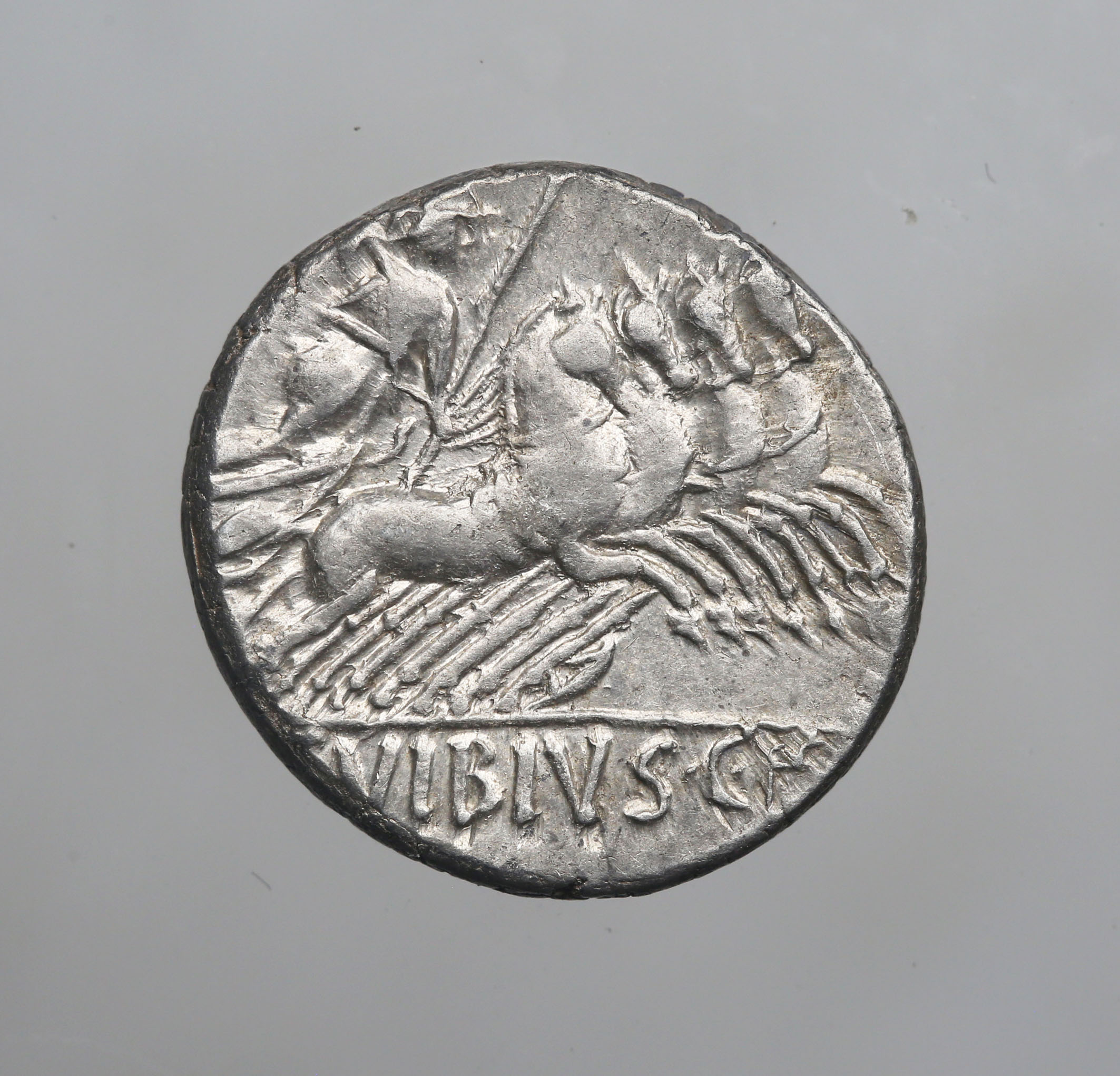 Dritto: Testa laureata di Apollo a d.; dietro, [PANSA]. Contorno perlinato. Rovescio: Minerva su quadriga verso d.; tiene la lancia e le redini con la mano s., un trofeo con la d.; in esergo, [C•]VIBIVS•C•F . Contorno perlinato