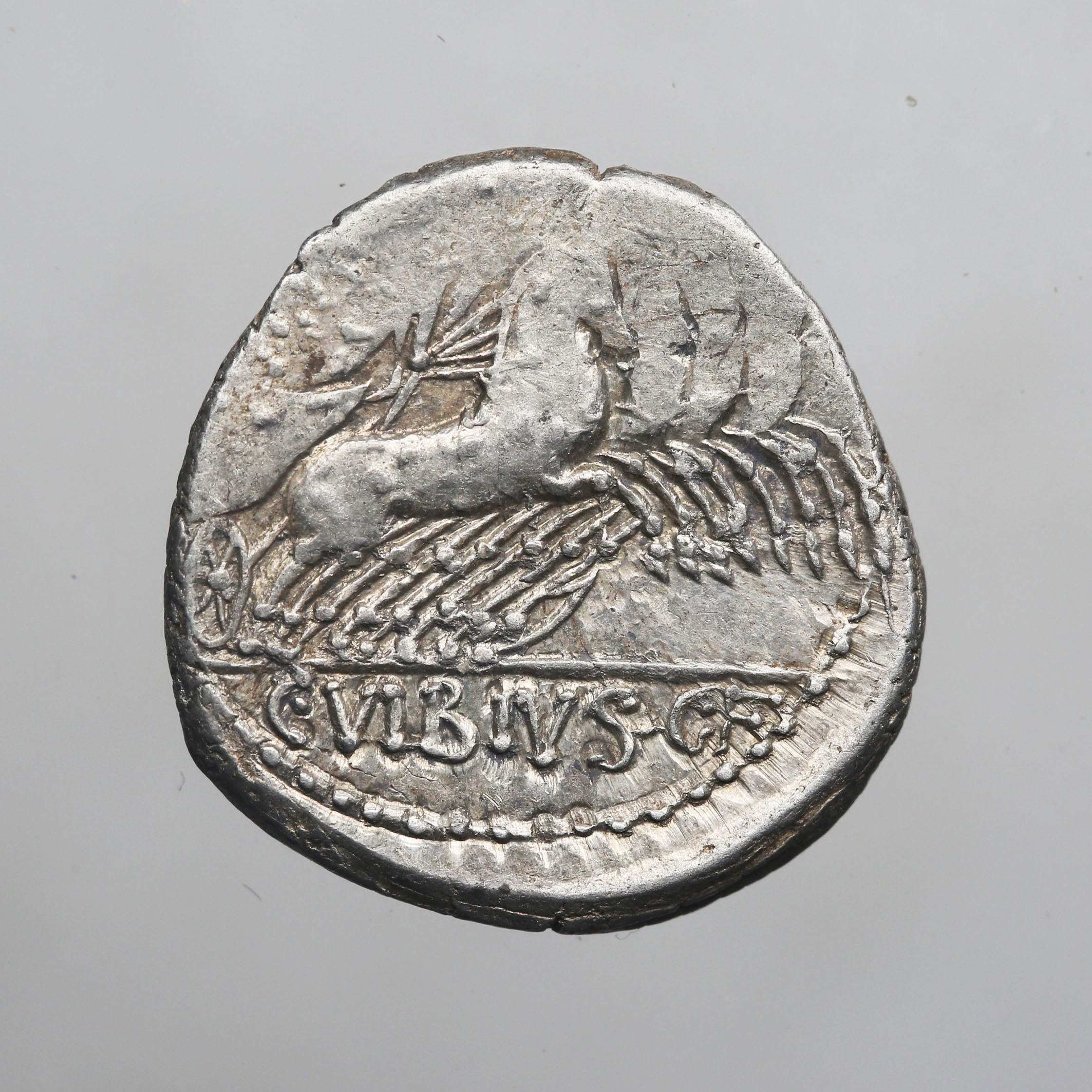 Dritto: Testa laureata di Apollo a d.; dietro, [PANSA]; davanti, un simbolo di controllo (anfora). Contorno perlinato. Rovescio: Minerva su quadriga verso d.; tiene la lancia e le redini con la mano s., un trofeo con la d.; in esergo, C•VIBIVS•C•F . Contorno perlinato
