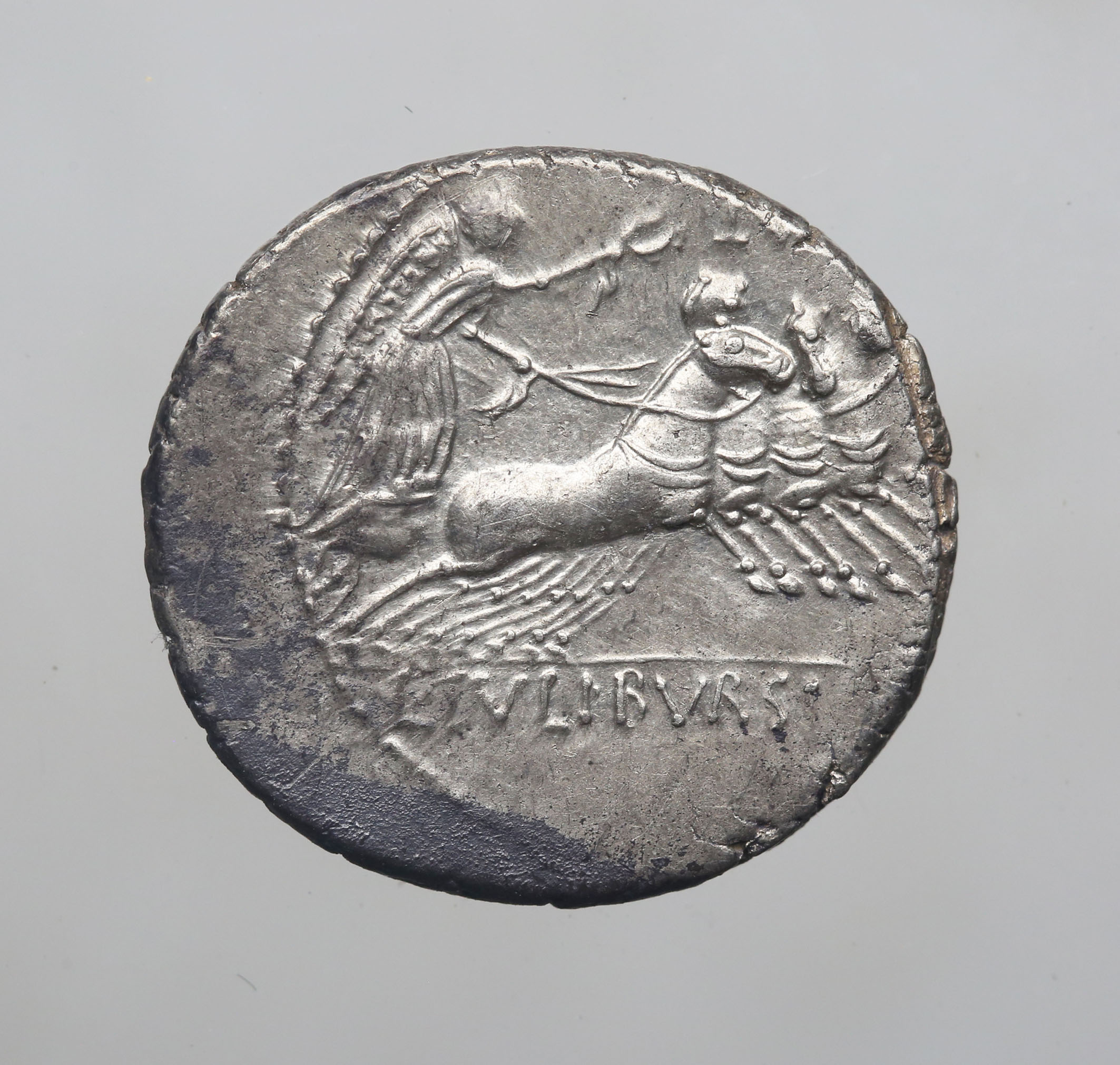 Dritto: Testa maschile a d., con corona d'alloro, piccole ali alle tempie e con tridente sulle spalle drappeggiate (gli attributi di Apollo, Mercurio e Nettuno); dietro, un simbolo di controllo (sedia curule). Contorno perlinato. Rovescio: La Vittoria su quadriga verso d.; tiene, le redini con la mano s. e la corona con la d.; sopra, [un numero o una lettera di controllo]; in esergo L•IVLI•BVRSI[O]. Contorno perlinato