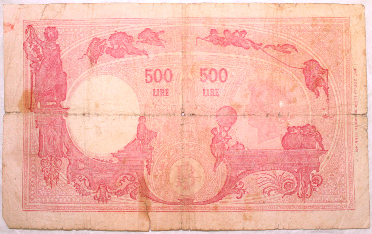 Dritto: Nel centro in alto stemma sabaudo coronato fra due putti, nel contorno a sinistra figura allegorica della Legge, a destra la Giustizia con putti ai suoi piedi. In basso contrassegno di Stato a Testina d'Italia. Nell'ovale a destra, filigrana con testa di Roma elmata con aletta. Rovescio: In alto a sinistra allegoria dell'Enologia, nell'ovale sulla destra testa dell'Italia turrita e nei contorni putti impegnati in varie attività. In basso: monogramma della Banca d'Italia. Nell'ovale a sinistra, filigrana con testa di Roma elmata con aletta