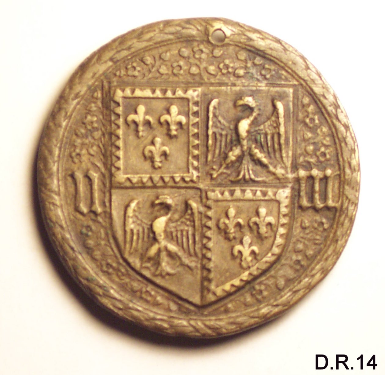 Dritto: busto di Niccolò III d'Este volto a d. con grosso berretto. Rovescio: stemma inquartato, con tre gigli e un'aquila, in capo fiorito, circondatoda corona d'alloro