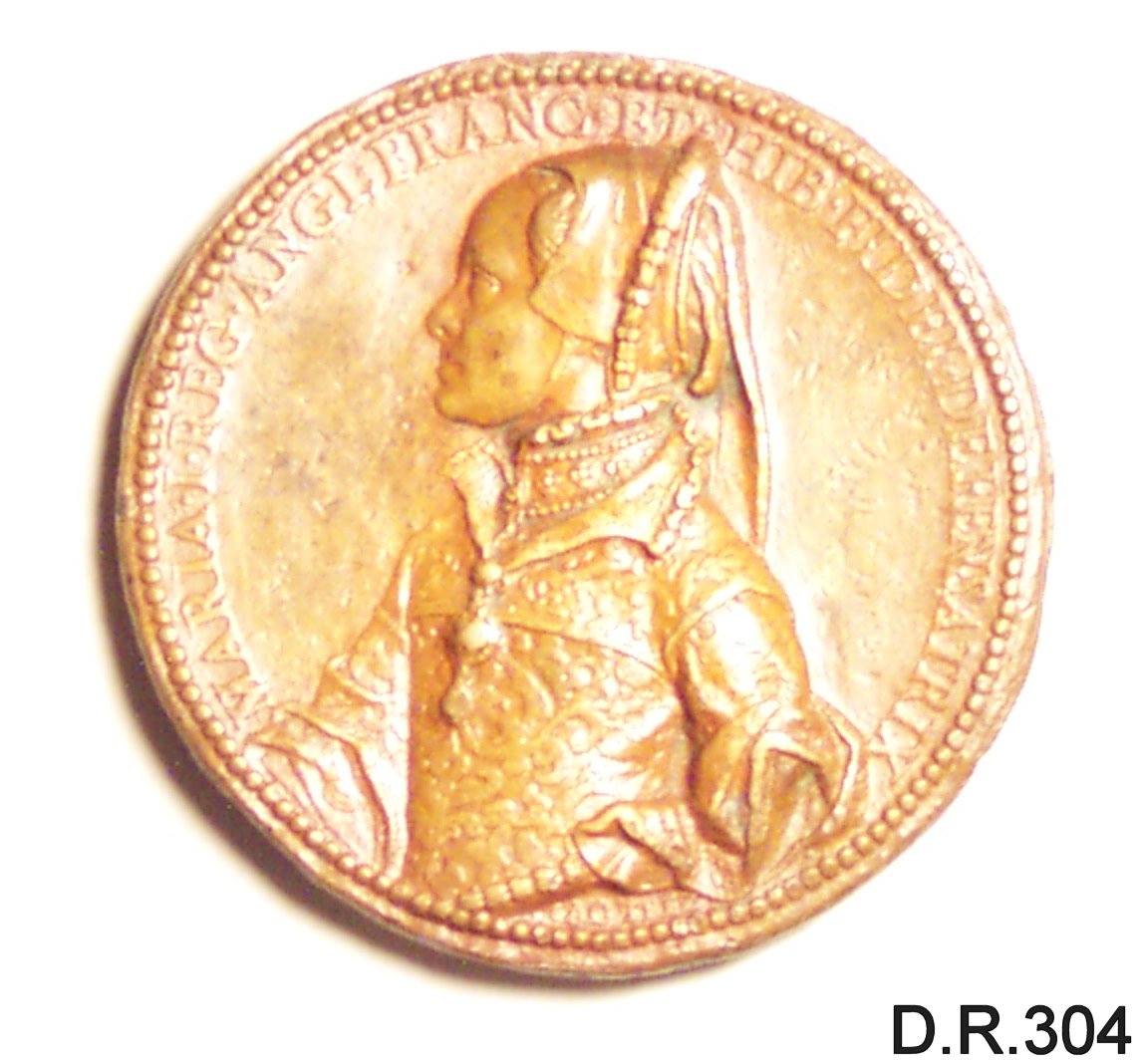 Dritto: busto della regina Maria Tudor volto a s., con corpetto ed altocollettorovesciato, groppo pendaglio sul petto, cuffia con cerchio dipietrepreziose. Rovescio: la Pace, seduta in trono e coronata, regge con la destra una palmaeincendia con la sinistra delle armi. a sinistra, un gruppo dipersonepiangenti, in atto di preghiera