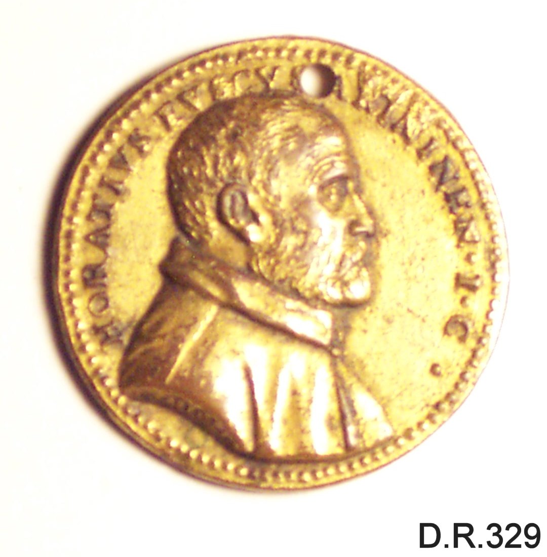 Dritto: busto di Orazio fusco volto a d. vestito di una ca.pa; capo nudo, barba. Rovescio: donna con fiamm. sulla fronte, nell'atto di sollevare un peso dallespalledi un'altra donna, in atteggiamento di dolore. a sinistracornucopie, inalto una stella