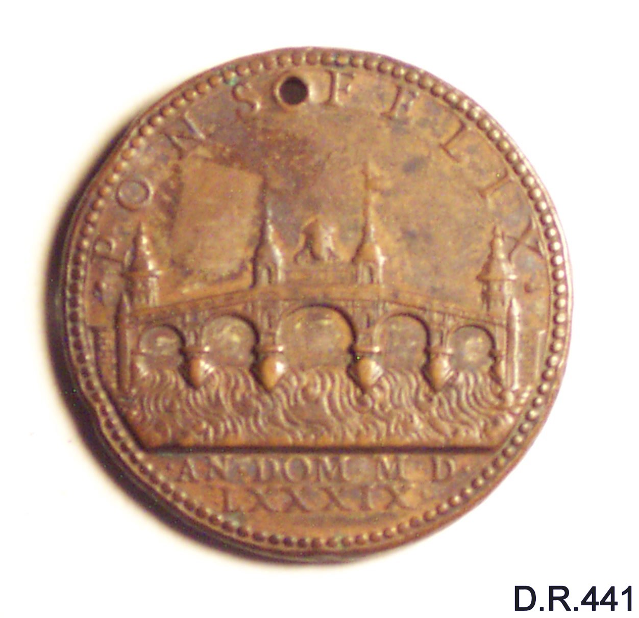 Dritto: busto di papa Sisto V volto d. con piviale; capo nudo, barba. Rovescio: il ponte felice a Roma
