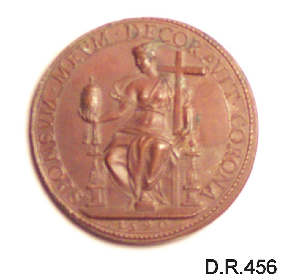 Dritto: busto di papa gregorio XIV volto con mozzetta e ca.auro; barba. Rovescio: donna seduta, con croce nella sinistra e triregno nella destra