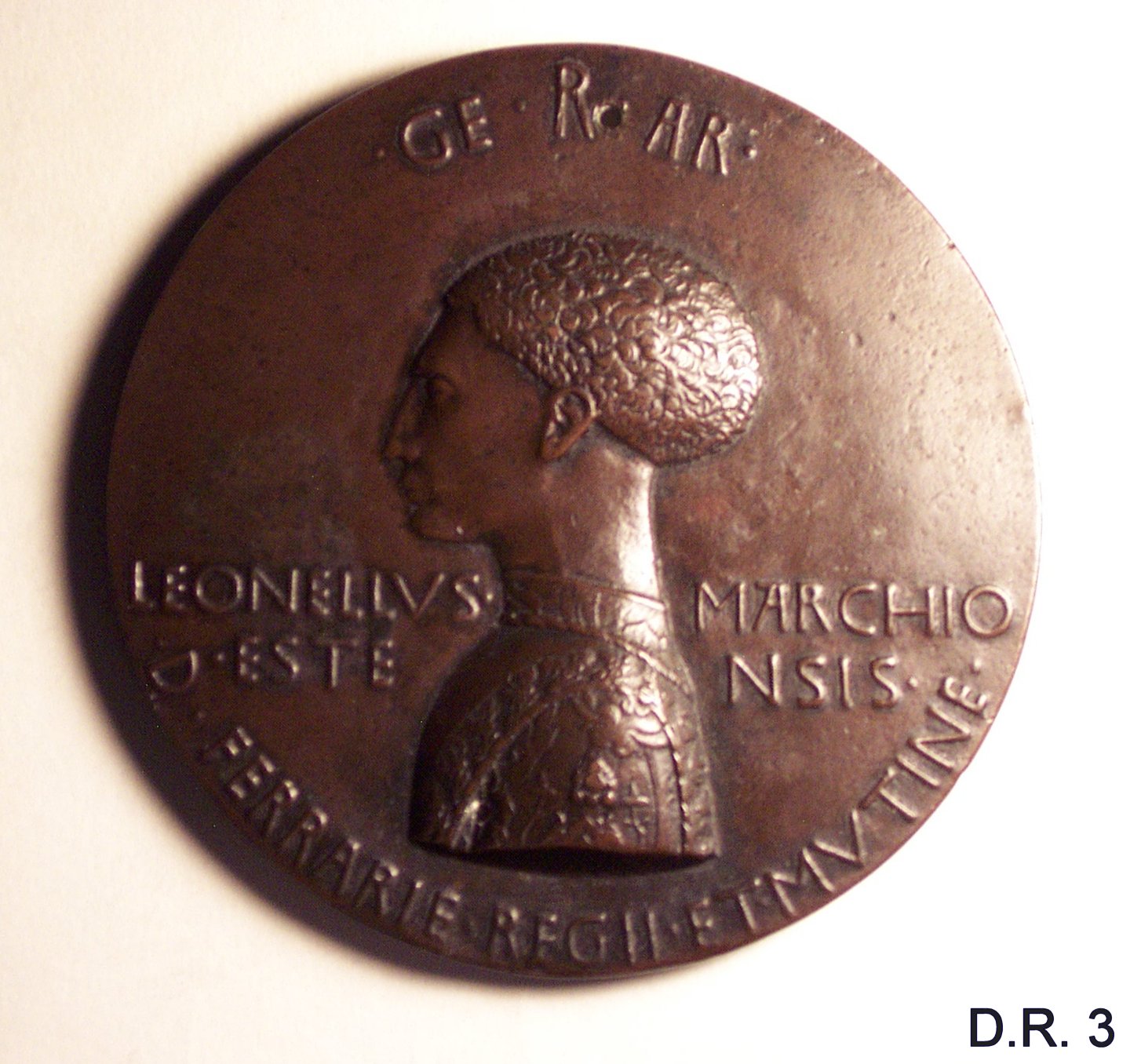 Dritto: busto di lionello d'este volto a s.; capo nudo. Rovescio: leone stante volto a destra, fermato nel suo camino da cupido alato,cheregge tra le mani una cata musicae. nel fondo, uno scoglio e unarbustosul quale e' posato un volatile. verso destra un pilastro che hasulfronte, a rilievo, un albero di nave con vela troncaa
