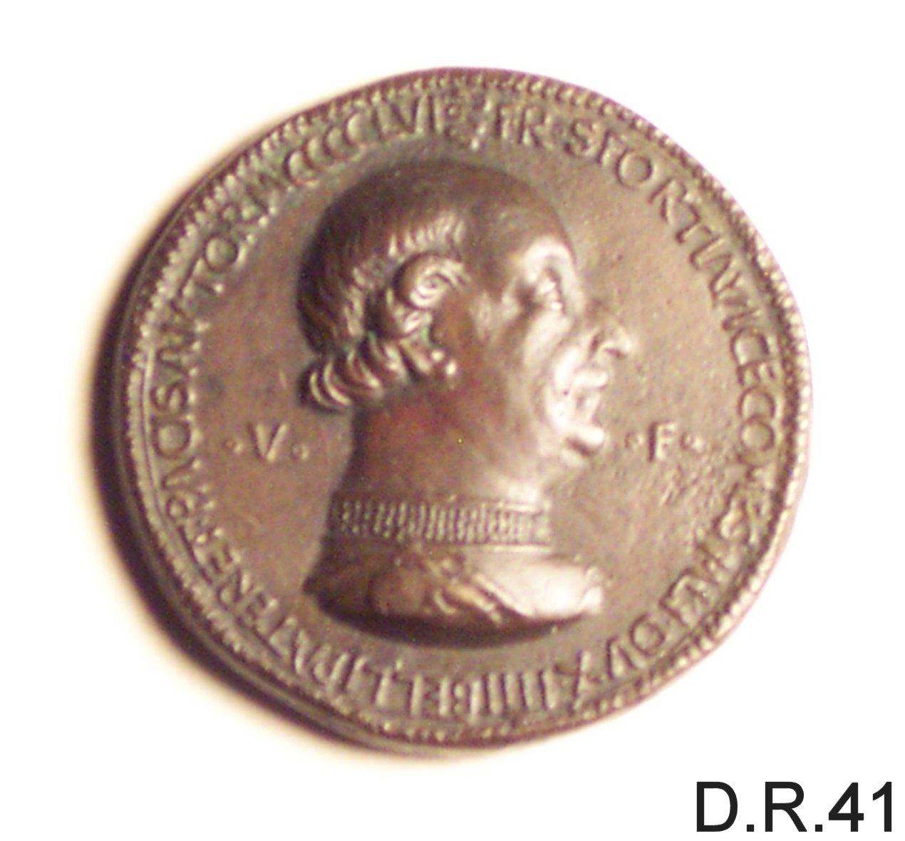Dritto: busto di francesco sforza volto a d.; capo nudo. Rovescio: cae levriero girato a sinistra, accosciato presso un albero; una manosiprotende al suo collo, attorniata da raggi
