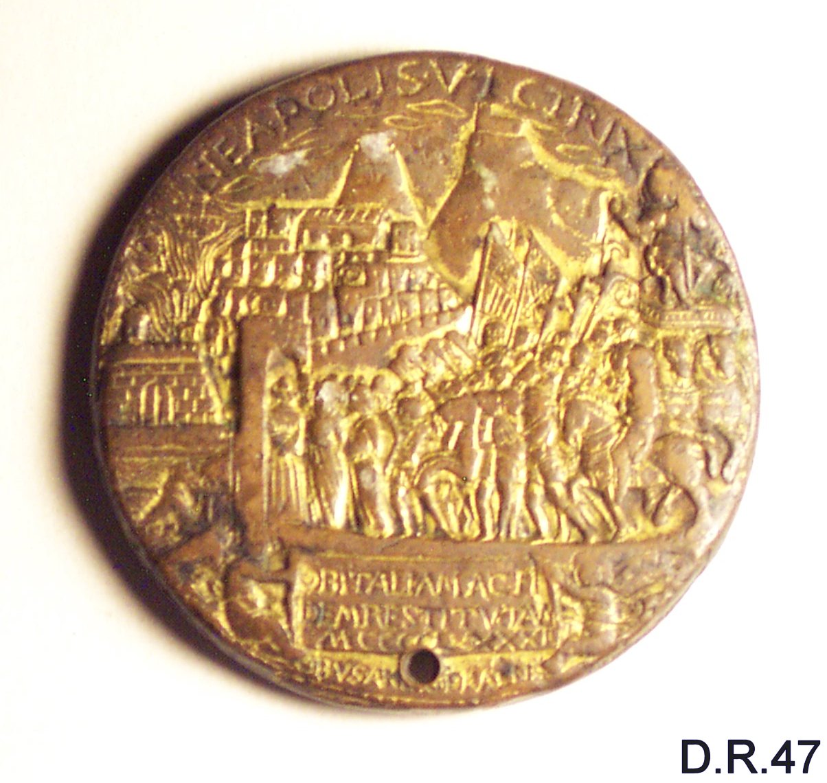 Dritto: busto volto di tre quarti di alfonzo ii d'aragona. ca.elli a zazzera,altoberetto adorno di un piccolo pennacchio sul lato s. corazza conmonogramm.asa sormontato da corona. Rovescio: il ducadi caabria entra trionfante a napoli, preceduto daturchiprigionieri. al di sotto due putti reggono un catello contenentelaseconda parte della legenda
