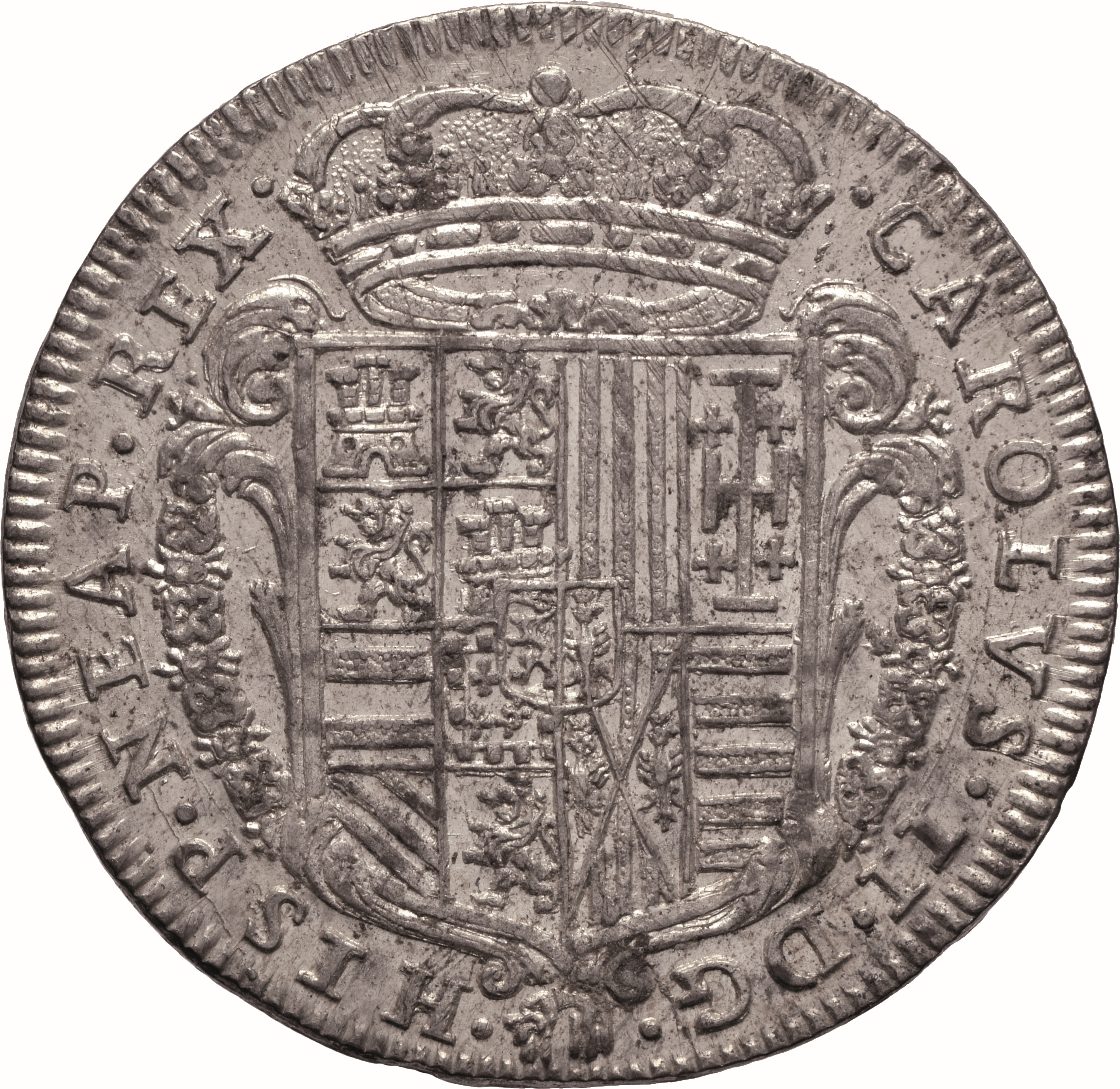 Dritto: Scudo sannitico coronato, in cartella ornata da rami di palma e circondata dal collare del Toson d’oro, inquartato: nel 1°, controinquartato di Castiglia e León; nel 2°, partito di Aragona e Gerusalemme; nel 3°, controinquartato di Austria, Nuovo Ducato di Borgogna, Vecchio Ducato di Borgogna e Brabante; nel 4°, partito di Sicilia e Ungheria; sul tutto, uno scudetto partito di Fiandre e Tirolo. Campo monetale delimitato da filetto dentellato. Rovescio: Globo terrestre sormontato da cornucopia e fascio littorio decussati e coronati; nel campo a s., A G | A; in basso, in rilievo sul globo, 1686. Campo monetale delimitato da filetto dentellato