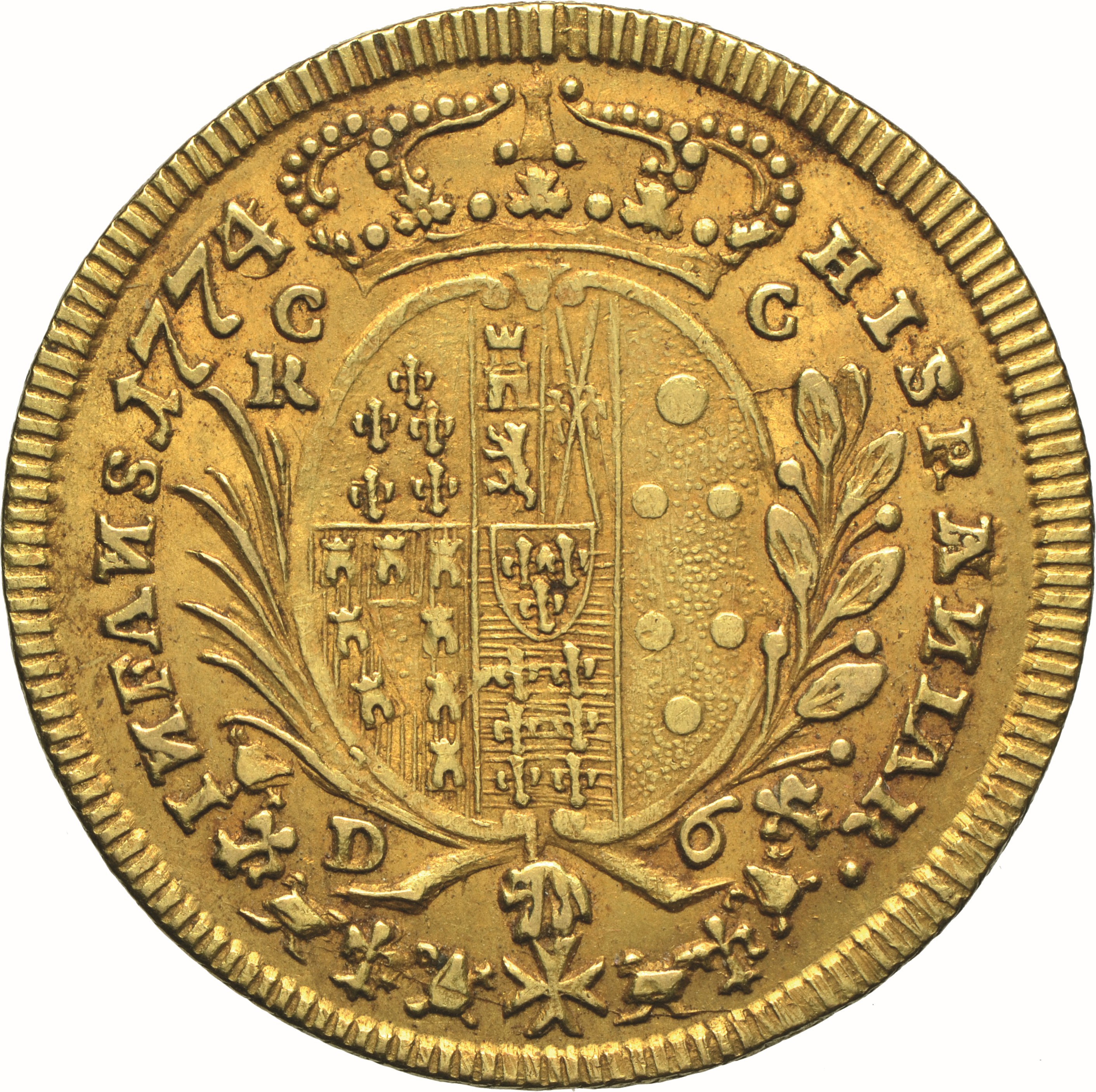 Dritto: Busto giovanile del re volto a d., a testa nuda con lunghi capelli sciolti, ammantato e con collare del Toson d’oro; sotto, ∙ B ∙ P ∙. Campo monetale delimitato da filetto dentellato. Rovescio: Scudo ovale coronato, in cartella semplice, cinto da un ramo di palma e uno di alloro decussati da cui pende il collare dell’Ordine dello Spirito Santo, interzato in palo: nel 1°, troncato di Farnese e di Portogallo; nel 2°, troncato: in a), partito, in 1, di Castiglia e León, in 2, di Sicilia, in b), di Angiò; nel 3°, di Medici. Nel centro, scudetto di Borbone; in punta è pendente il Toson d’oro. In alto, ai lati, C∙ / C∙; a sinistra, R; in basso, D∙ / 6. Campo monetale delimitato da filetto dentellato. T/ cordone