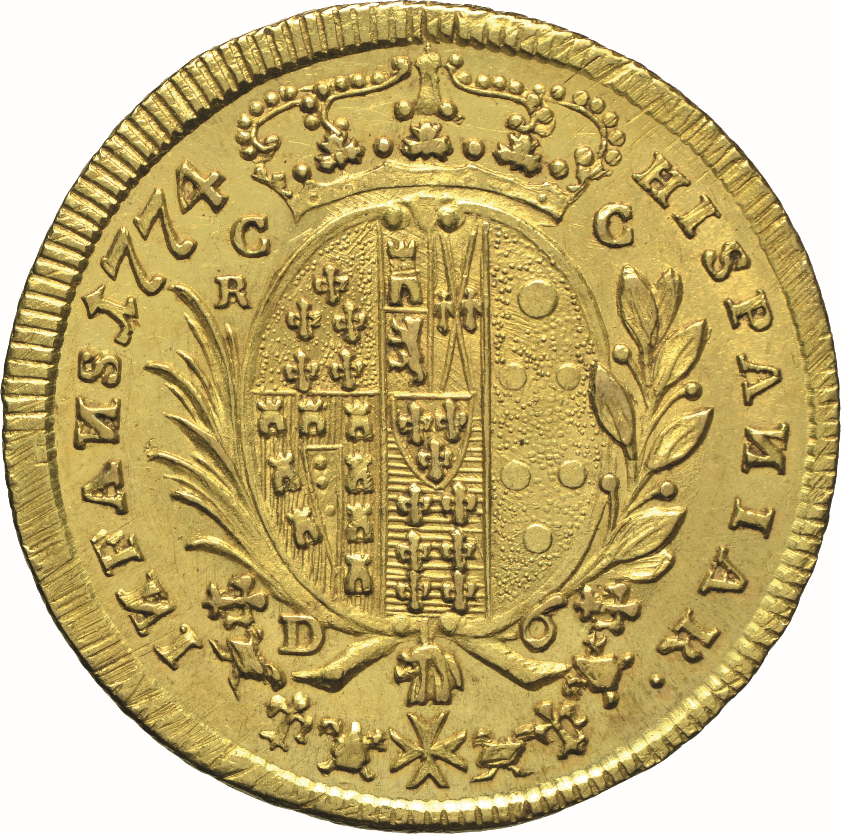 Dritto: Busto giovanile del re volto a d., a testa nuda con lunghi capelli sciolti, ammantato e con collare del Toson d’oro; sotto, ∙ B ∙ P ∙. Campo monetale delimitato da filetto dentellato. Rovescio: Scudo ovale coronato, in cartella semplice, cinto da un ramo di palma e uno di alloro decussati da cui pende il collare dell’Ordine dello Spirito Santo, interzato in palo: nel 1°, troncato di Farnese e di Portogallo; nel 2°, troncato: in a), partito, in 1, di Castiglia e León, in 2, di Sicilia, in b), di Angiò; nel 3°, di Medici. Nel centro, scudetto di Borbone; in punta è pendente il Toson d’oro. In alto, ai lati, C∙ / C∙; a sinistra, R; in basso, D∙ / 6. Campo monetale delimitato da filetto dentellato. T/ cordone