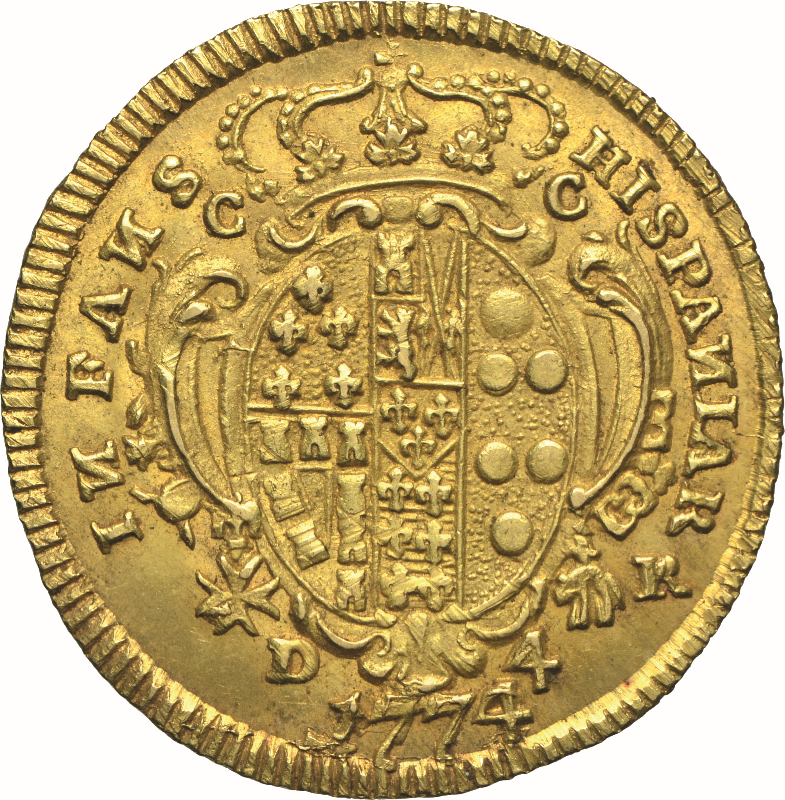Dritto: Busto giovanile del re volto a d., a testa nuda con lunghi capelli sciolti, con corazza e collare del Toson d’oro; sotto, P∙. Campo monetale delimitato da filetto dentellato. Rovescio: Scudo ovale coronato, in cartella ornata da rami di palma dai quali pendono i collari dell’Ordine del Toson d’oro e dell’Ordine dello Spirito Santo, interzato in palo: nel 1°, troncato di Farnese e di Portogallo; nel 2°, troncato: in a), partito, in 1, di Castiglia e León, in 2, di Sicilia, in b), di Angiò; nel 3°, di Medici. Nel centro, scudetto di Borbone. Sotto lo stemma, D / 4∙ | 17/74. Nel campo, in alto, C - C, in basso a d., R. Campo monetale delimitato da filetto dentellato. T/ cordone