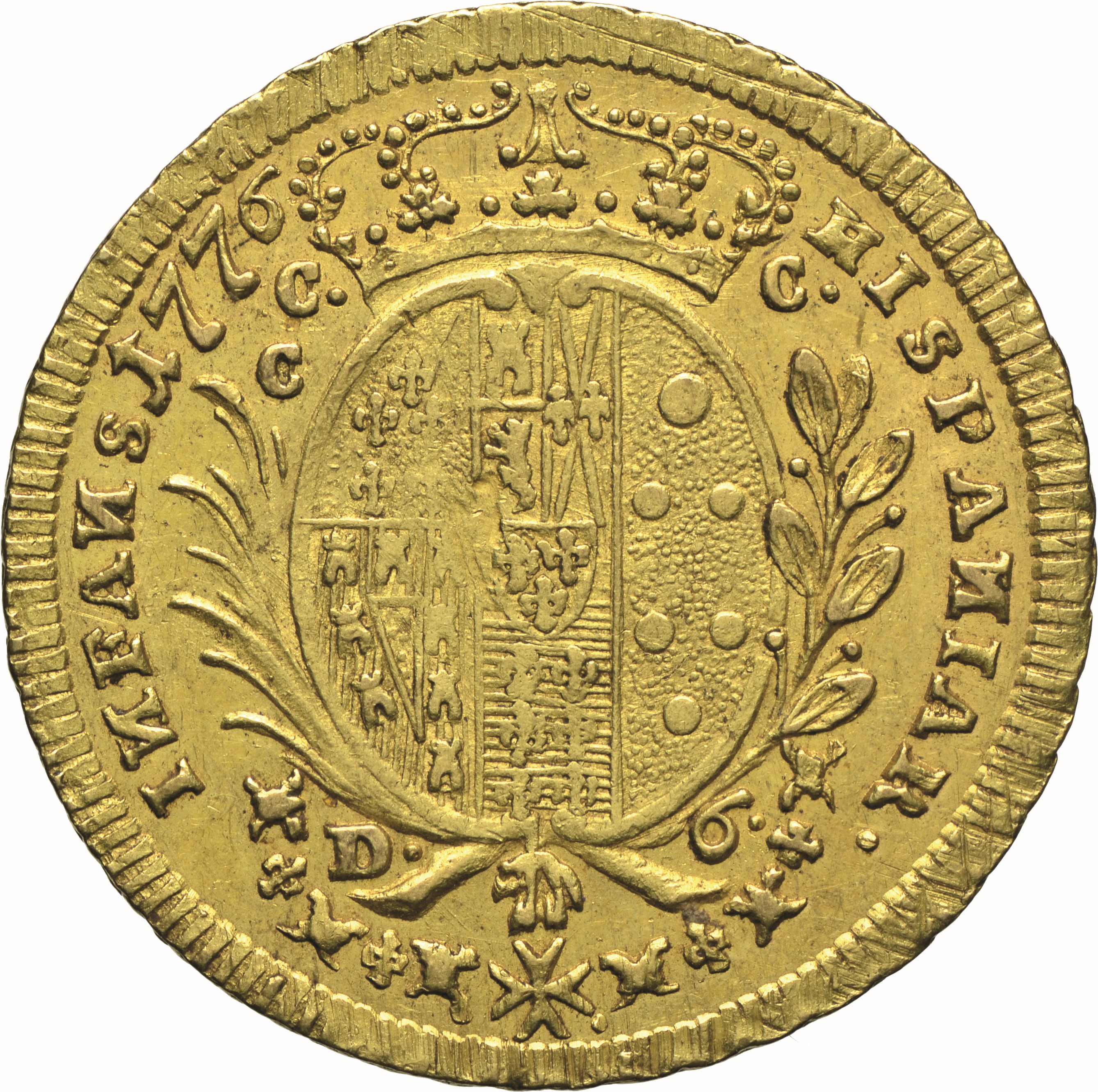 Dritto: Busto giovanile del re volto a d., a testa nuda con lunghi capelli sciolti, ammantato e con collare del Toson d’oro; sotto, B ✿ P. Campo monetale delimitato da filetto dentellato. Rovescio: Scudo ovale coronato, in cartella semplice, cinto da un ramo di palma e uno di alloro decussati da cui pende il collare dell’Ordine dello Spirito Santo, interzato in palo: nel 1°, troncato di Farnese e di Portogallo; nel 2°, troncato: in a), partito, in 1, di Castiglia e León, in 2, di Sicilia, in b), di Angiò; nel 3°, di Medici. Nel centro, scudetto di Borbone; in punta è pendente il Toson d’oro. In alto, ai lati, C∙ / C∙; a sinistra, C; in basso, D∙ / 6∙. Campo monetale delimitato da filetto dentellato. T/ foglie