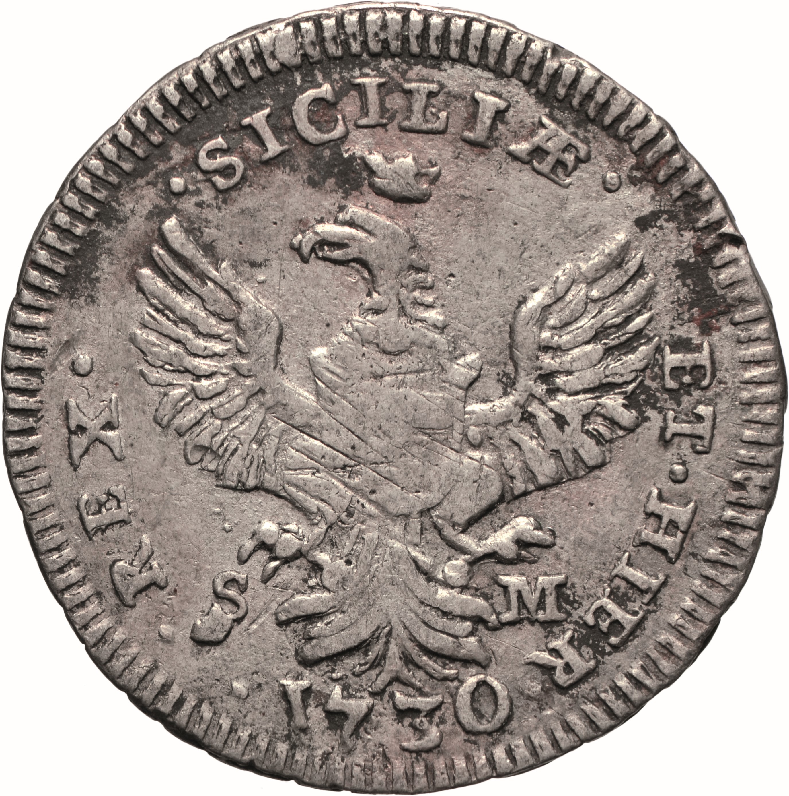 Dritto: Busto laureato del re volto a d., con lunga capigliatura e corazza ornata da drappeggio; sotto il busto, ∙ C ∙ P ∙ . Campo monetale delimitato da filetto dentellato. Rovescio: Aquila coronata ad ali spiegate, con testa volta a s. e caricata da scudo d’Austria in cartella; ai lati della coda, S - M; sotto, ∙ 1730. Campo monetale delimitato da filetto dentellato