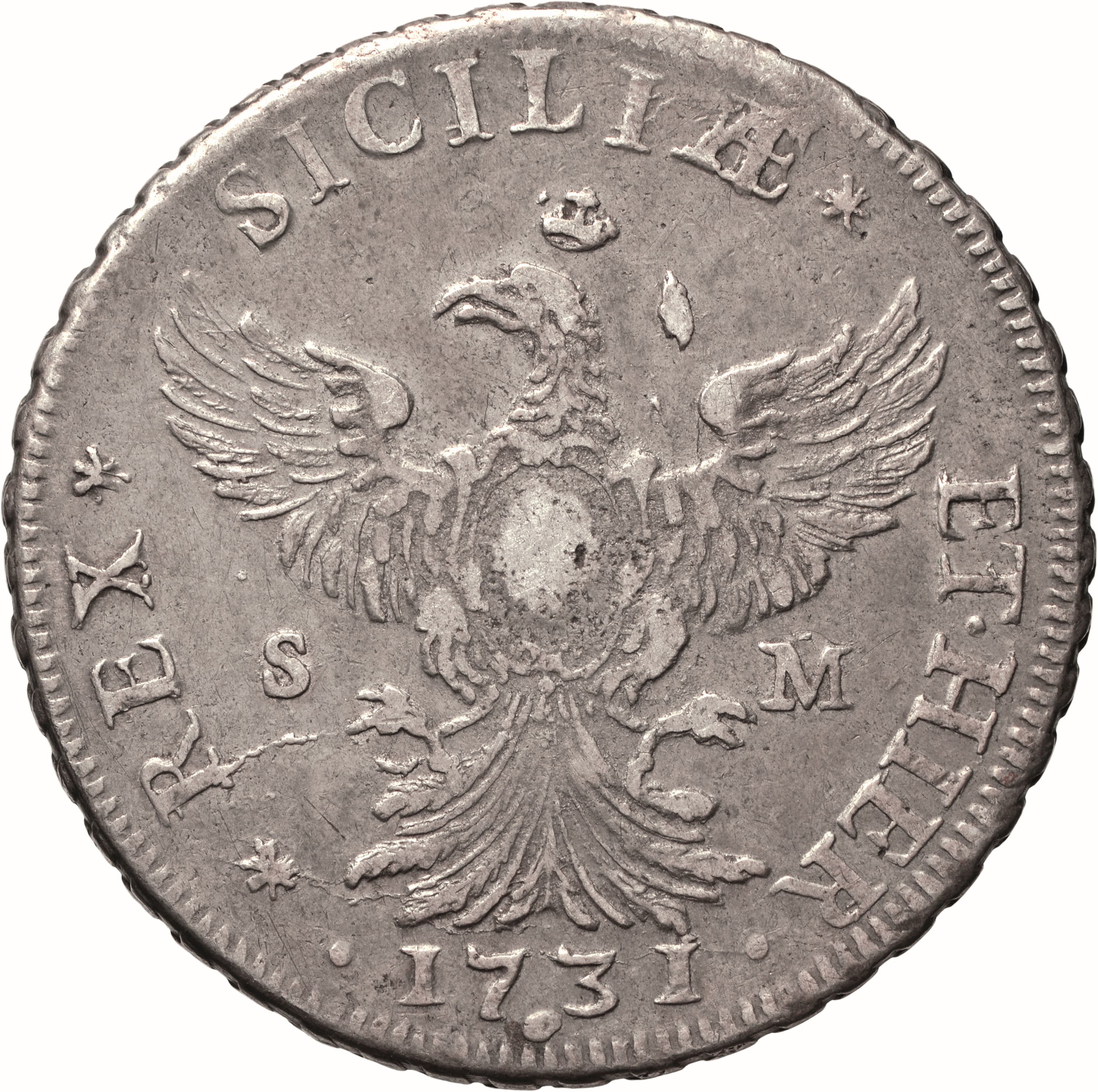 Dritto: Busto laureato del re volto a d., con lunga capigliatura e corazza ornata da drappeggio; sotto, ✶ C ✶ P ✶. Campo monetale delimitato da filetto dentellato. Rovescio: Aquila coronata ad ali spiegate, con testa volta a s. e caricata da scudo d’Austria in cartella; sotto le ali, S - M; sotto la coda, ∙ 1731 ∙. Campo monetale delimitato da filetto dentellato