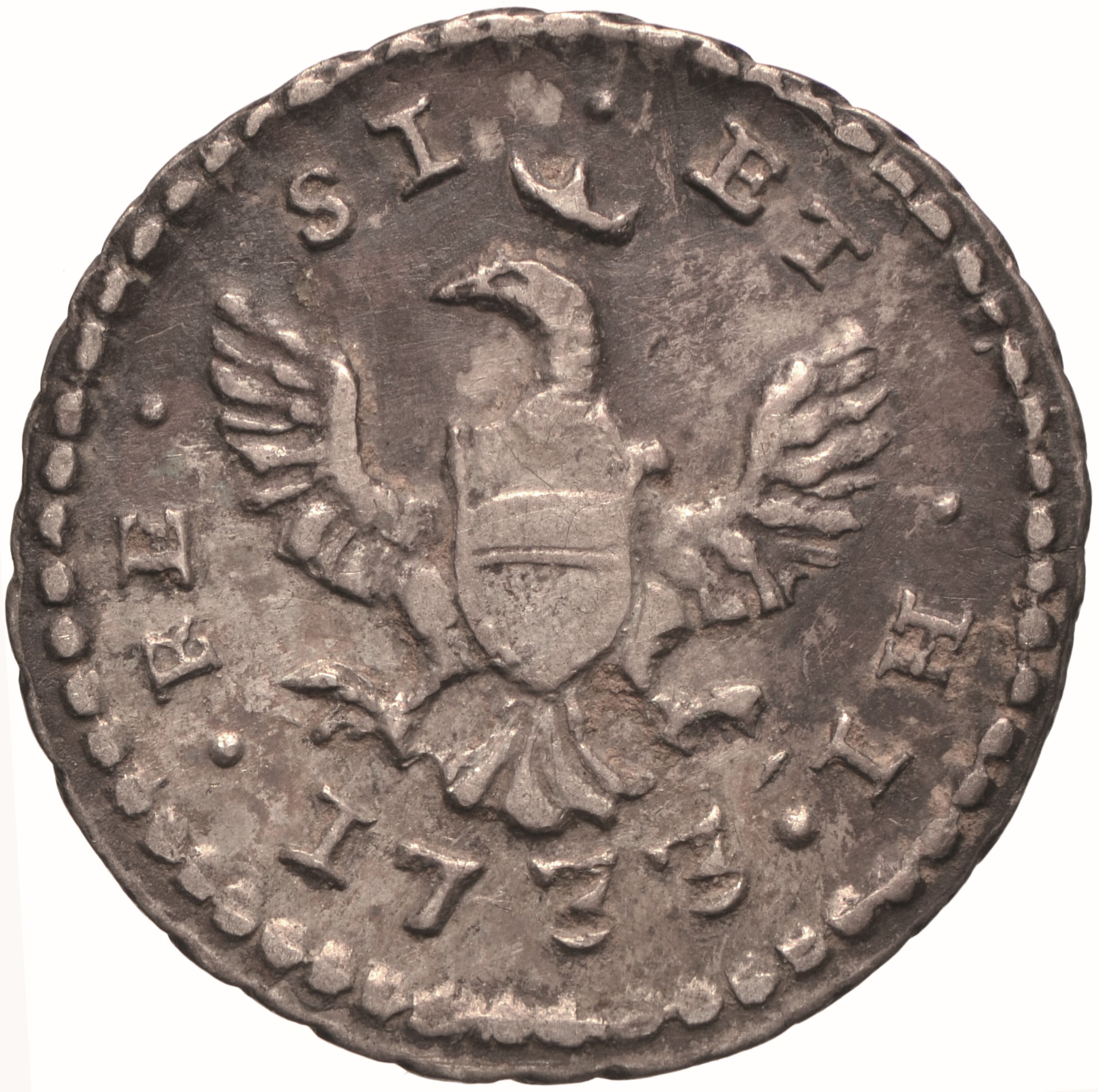 Dritto: Testa laureata del re volta a d., con lunghi capelli. Campo monetale delimitato da filetto perlinato. Rovescio: Aquila coronata ad ali spiegate, con testa volta a s. e caricata da scudo d’Austria; sotto, 1733. Campo monetale delimitato da filetto perlinato