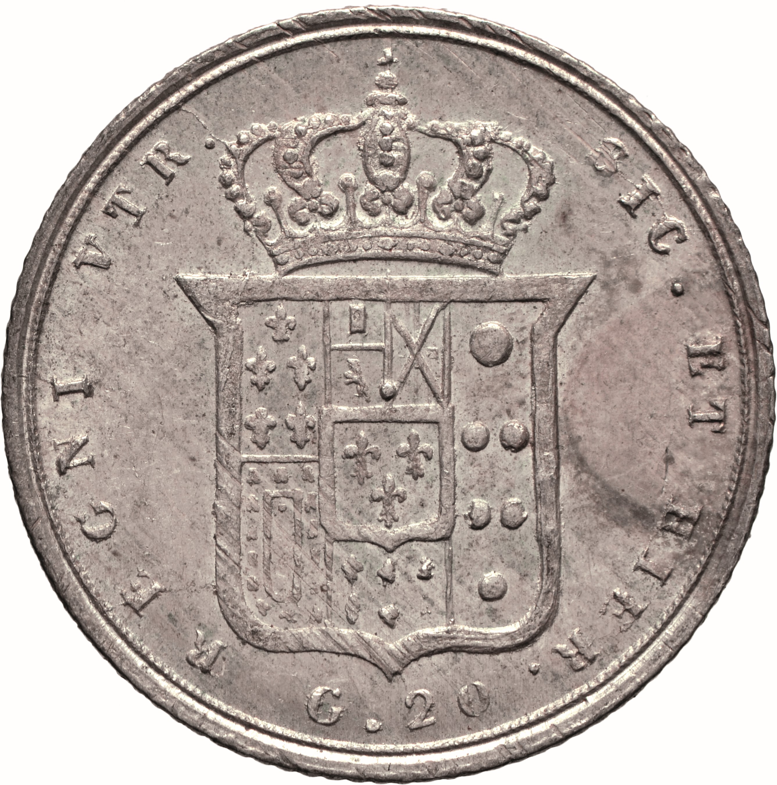 Dritto: Testa nuda adulta del re volta a d.; sotto, 1852. Campo monetale delimitato da cornice liscia e filetto perlinato. Rovescio: Scudo coronato, in cartella semplice, interzato in palo: nel 1°, troncato di Farnese e di Portogallo; nel 2°, troncato: in a), partito, in 1, di Castiglia e León, in 2, di Sicilia, in b), di Angiò; nel 3°, di Medici; nel centro, scudetto di Borbone; sotto, nel giro della legenda, G. 20. Campo monetale delimitato da cornice con filetto perlinato