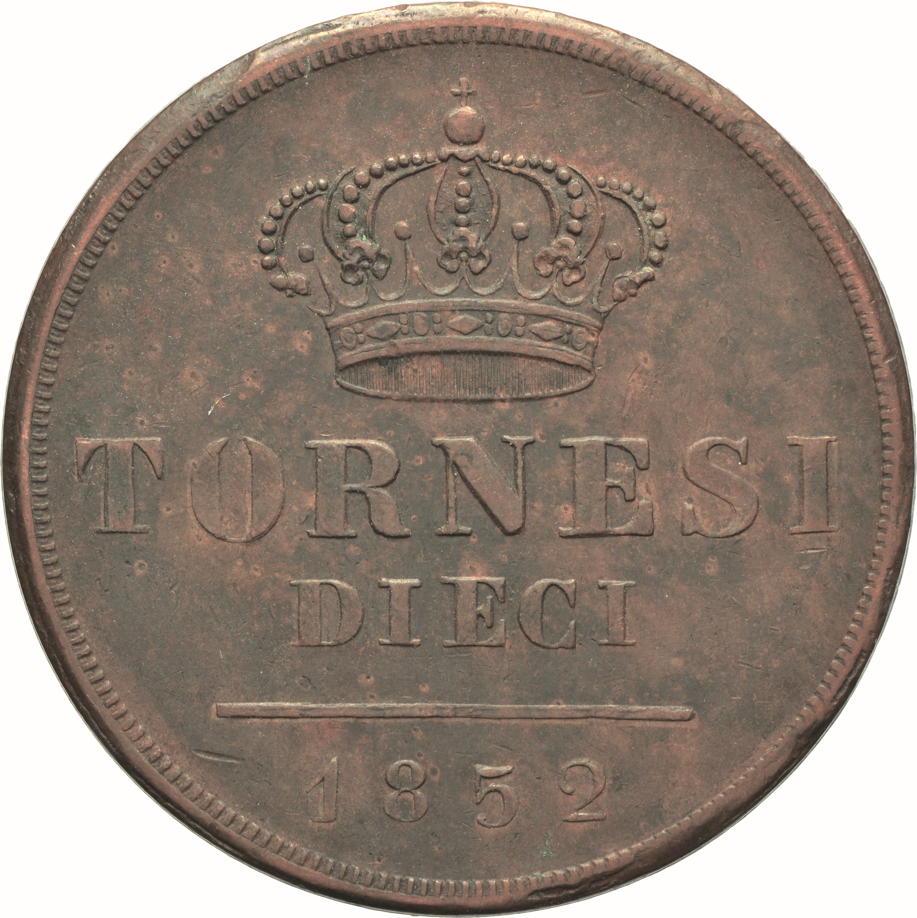Dritto: Testa nuda matura del re volta a d.; sotto, (stella). Campo monetale delimitato da cornice liscia e filetto dentellato. Rovescio: Nel campo: corona reale | TORNESI | DIECI; in esergo, 1852. Campo monetale delimitato da cornice liscia e filetto dentellato
