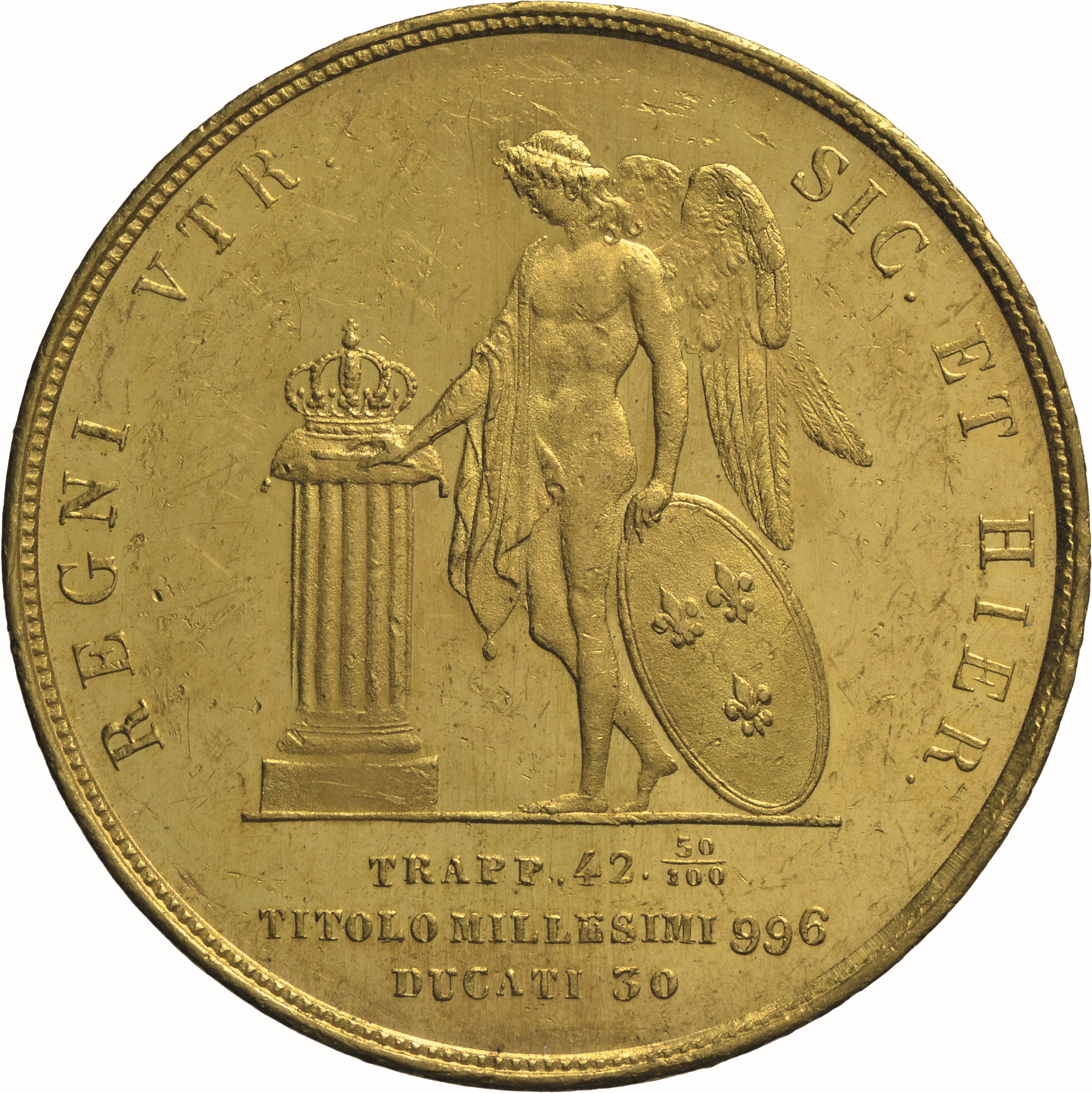 Dritto: Testa nuda matura del re volta a d.; sotto, 1854. Campo monetale delimitato da cornice liscia e filetto dentellato. Rovescio: Genio borbonico alato volto a s., in piedi, con la mano d. poggiata su colonna, sulla quale è adagiato un cuscino con corona reale, e con la s. sostiene uno scudo con l’arme di Borbone; in esergo, TRAPP. 42. 50 | 100 | TITOLO MILLESIMI 996 | DUCATI 30. Campo monetale delimitato da cornice liscia e filetto dentellato
