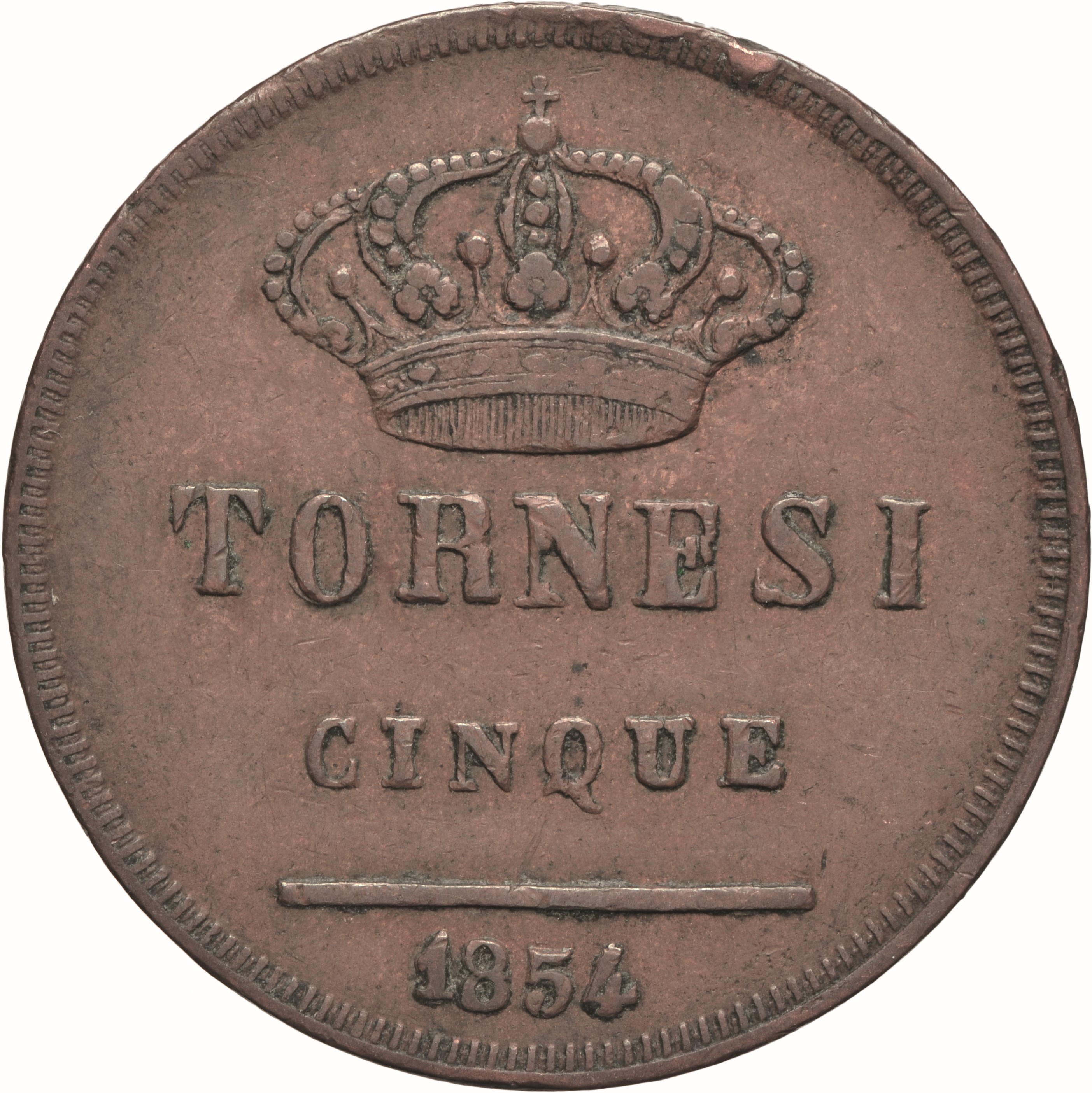 Dritto: Testa nuda adulta del re volta a d.; sotto, «. Campo monetale delimitato da cornice liscia e filetto dentellato. Rovescio: Nel campo: corona reale | TORNESI | CINQUE; in esergo, 1854. Campo monetale delimitato da cornice liscia e filetto dentellato
