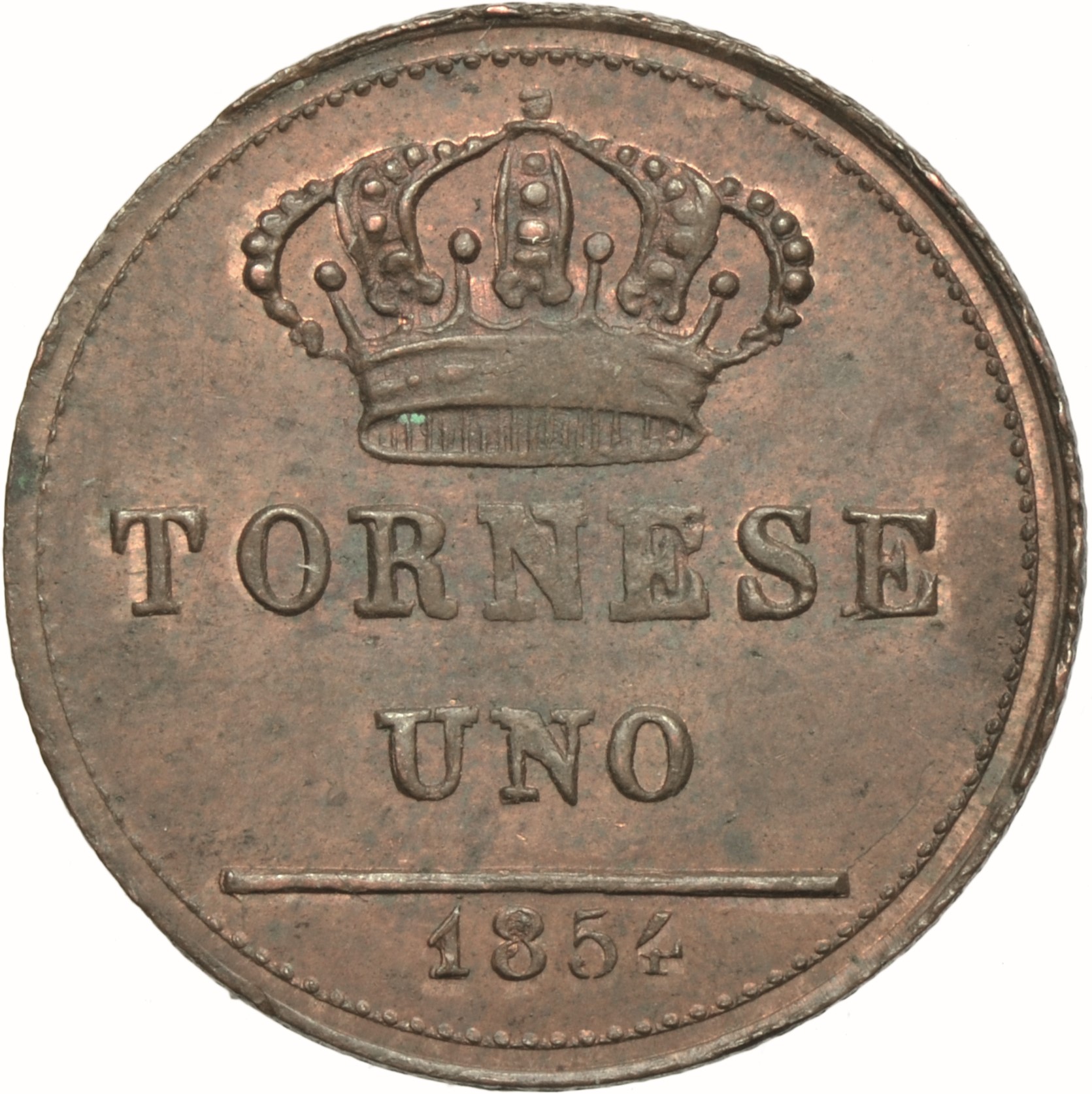 Dritto: Testa nuda matura del re volta a d.; sotto, (stella). Campo monetale delimitato da cornice liscia e filetto perlinato. Rovescio: Nel campo: corona reale | TORNESE | UNO; in esergo, 1854. Campo monetale delimitato da cornice liscia e filetto perlinato