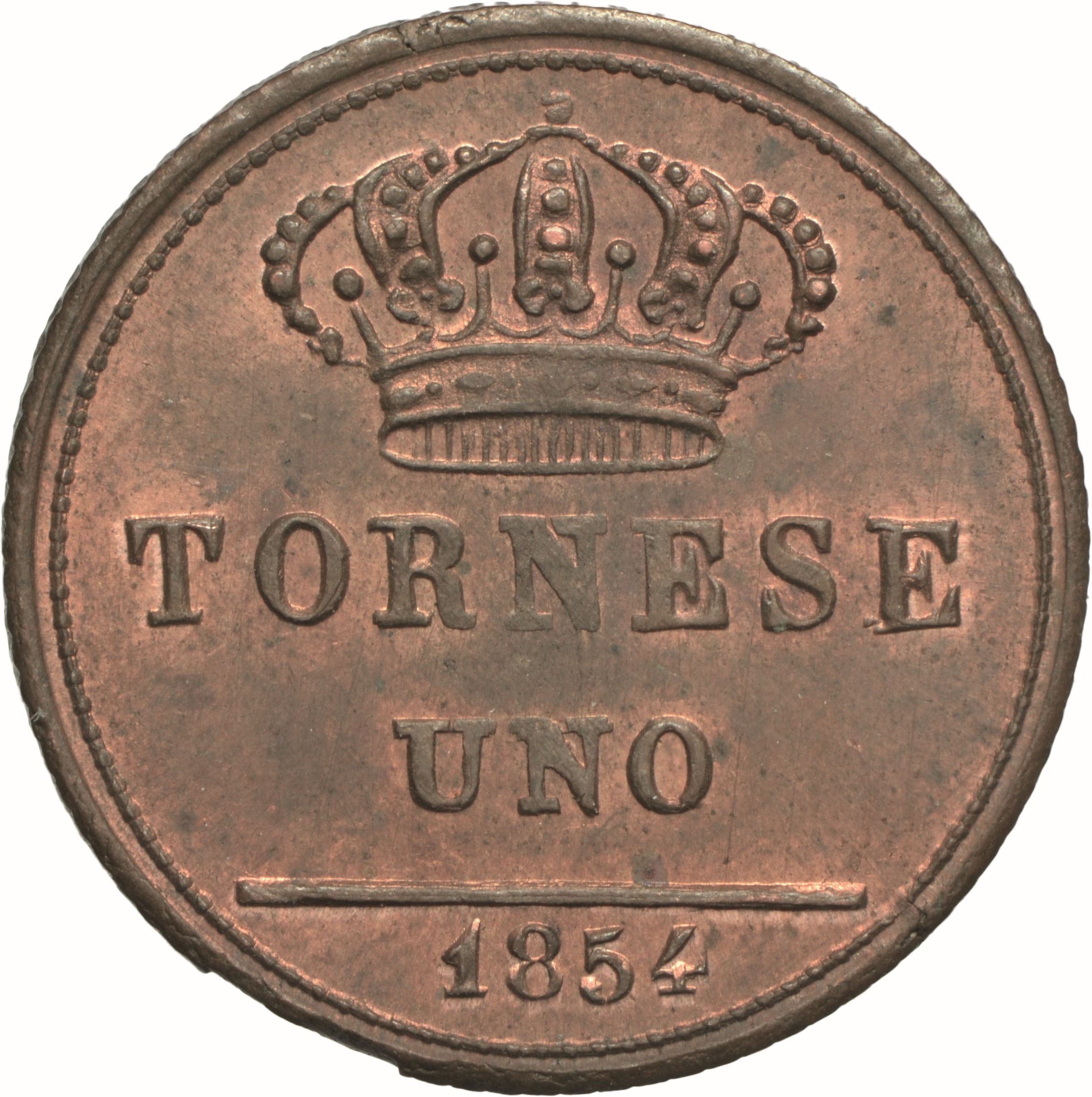 Dritto: Testa nuda matura del re volta a d.; sotto, (stella). Campo monetale delimitato da cornice liscia e filetto perlinato. Rovescio: Nel campo: corona reale | TORNESE | UNO; in esergo, 1854. Campo monetale delimitato da cornice liscia e filetto perlinato
