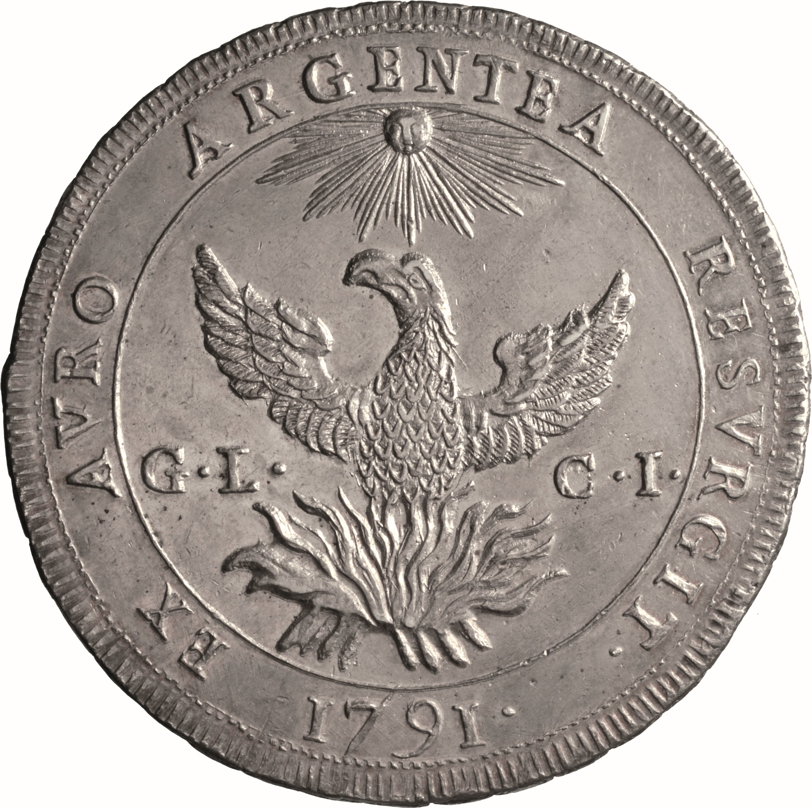 Dritto: Busto corazzato del re volto a d., a testa nuda con lunghi capelli. Campo monetale delimitato da filetto dentellato. Rovescio: In cerchio lineare, illuminata dal sole con volto umano, la fenice ad ali spiegate e con testa volta a sinistra risorge dalle fiamme; in basso, ai lati, G ∙ L ∙ - C ∙ I ∙; sotto, nel giro della legenda, 1791 ∙. Campo monetale delimitato da filetto dentellato
