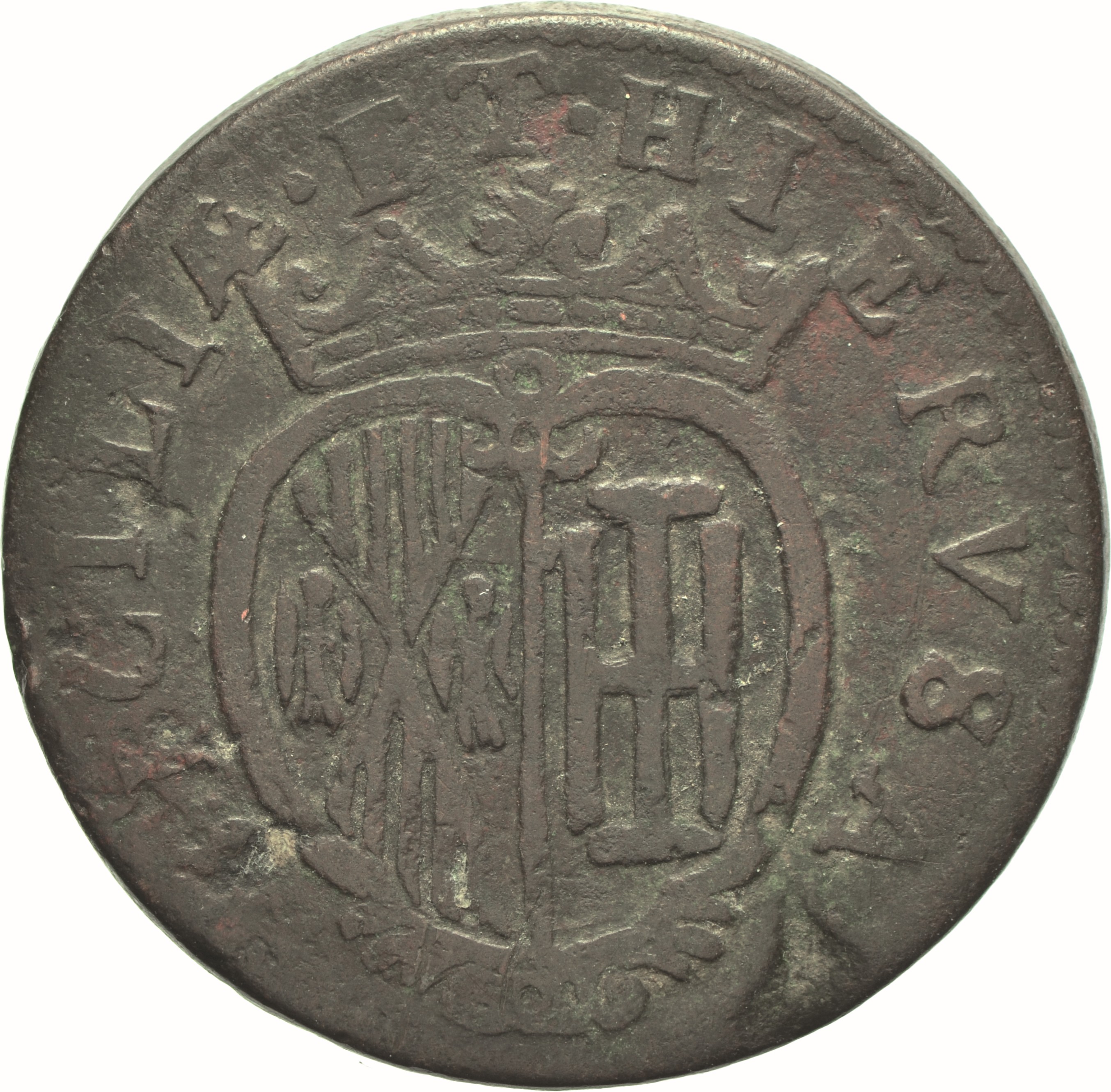 Dritto: Busto a testa nuda del re volto a destra, con lunga capigliatura e corazza ornata da sciarpa; sotto il busto, · 82 ·; nel campo a s., A C | A. Campo monetale delimitato da filetto perlinato. Rovescio: Scudo a cuore coronato, partito di Sicilia e Gerusalemme. Campo monetale delimitato da filetto perlinato