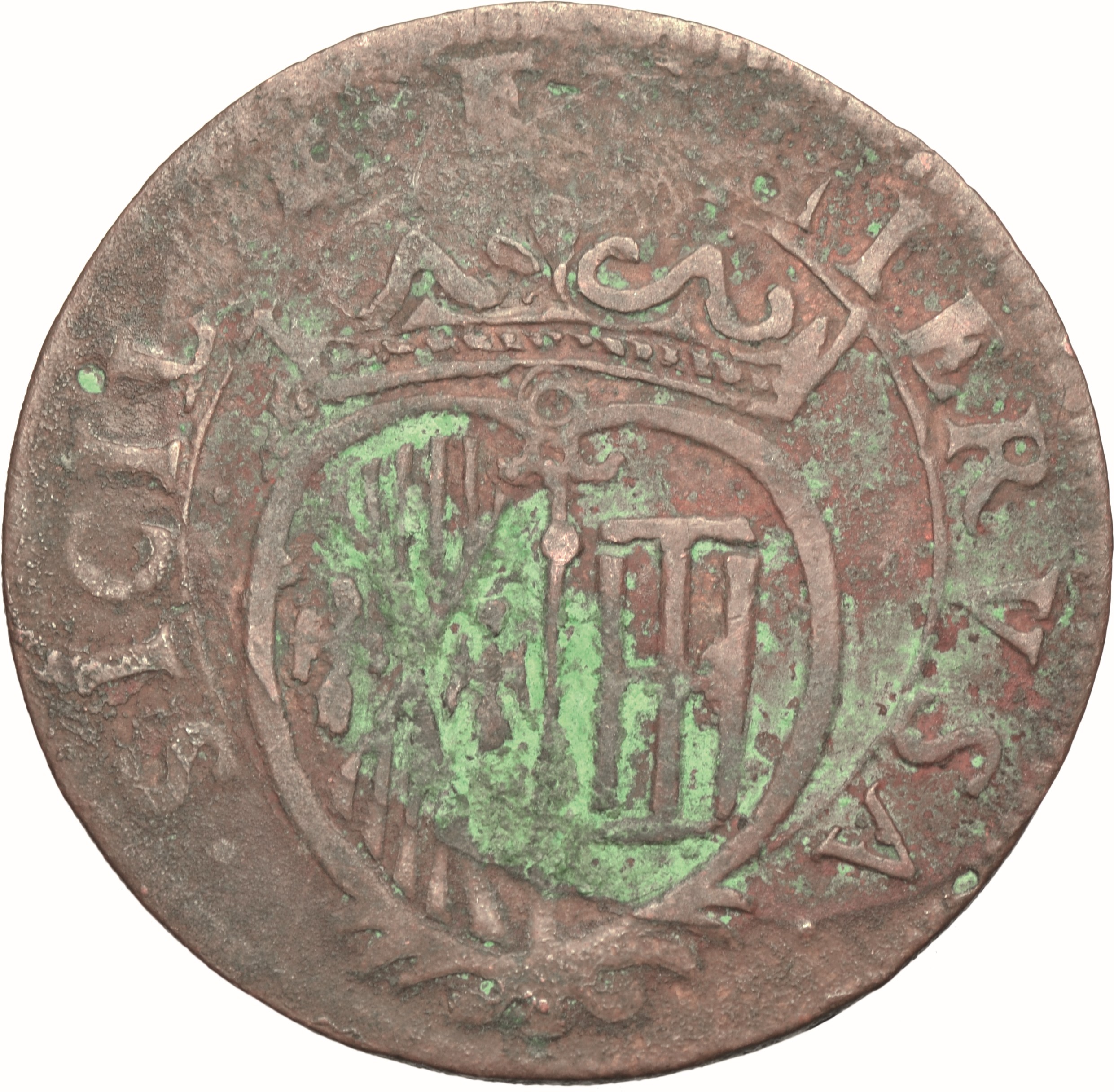 Dritto: Busto a testa nuda del re volto a destra, con lunga capigliatura e corazza ornata da sciarpa; sotto il busto, 83 ∙; nel campo a s., A C | A. Campo monetale delimitato da filetto dentellato. Rovescio: Scudo a cuore coronato, partito di Sicilia e Gerusalemme. Campo monetale delimitato da filetto dentellato