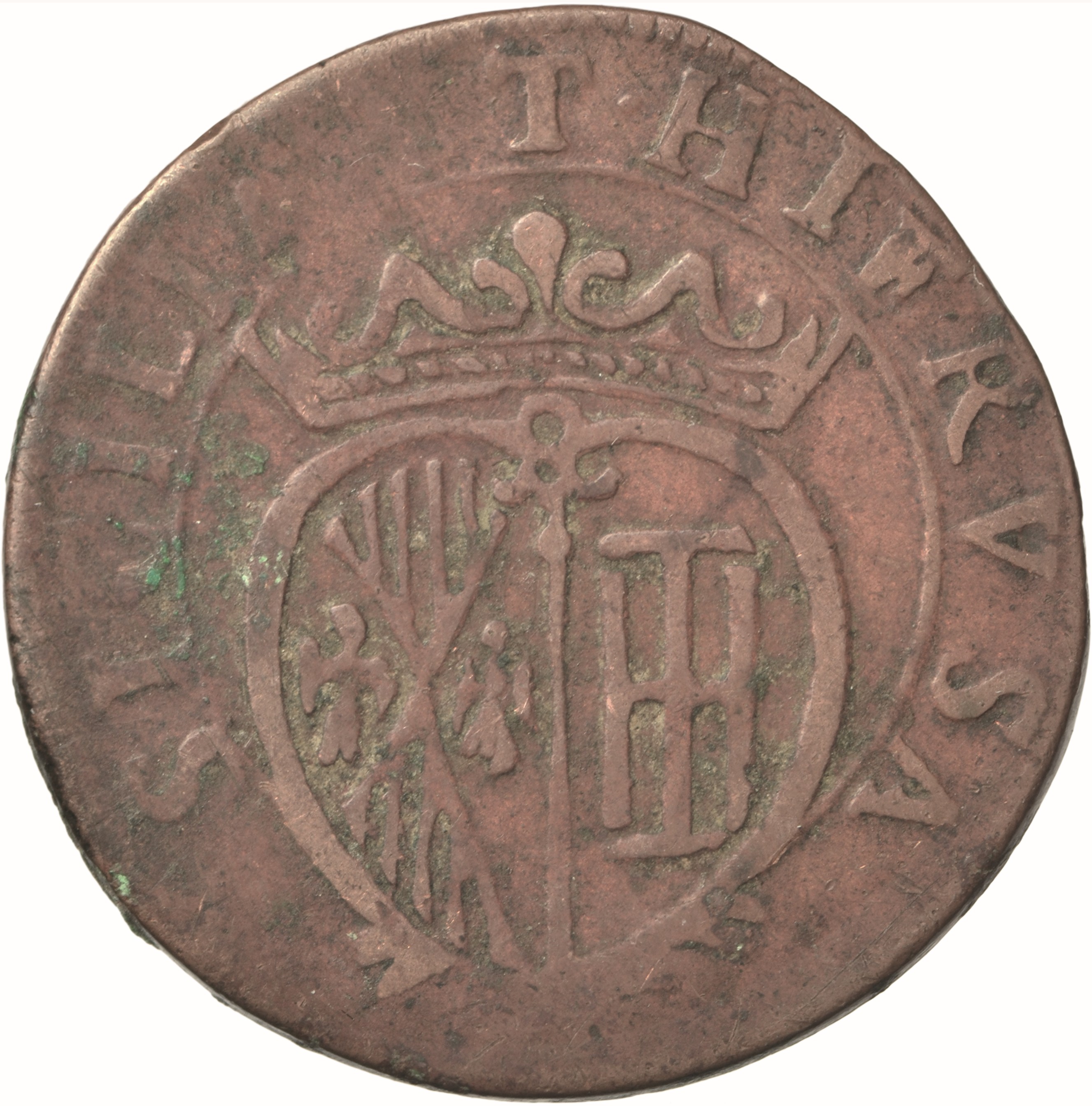 Dritto: Busto a testa nuda del re volto a destra, con lunga capigliatura e corazza ornata da sciarpa; sotto il busto, 83 ∙; nel campo a s., A C | A. Campo monetale delimitato da filetto dentellato. Rovescio: Scudo a cuore coronato, partito di Sicilia e Gerusalemme. Campo monetale delimitato da filetto dentellato